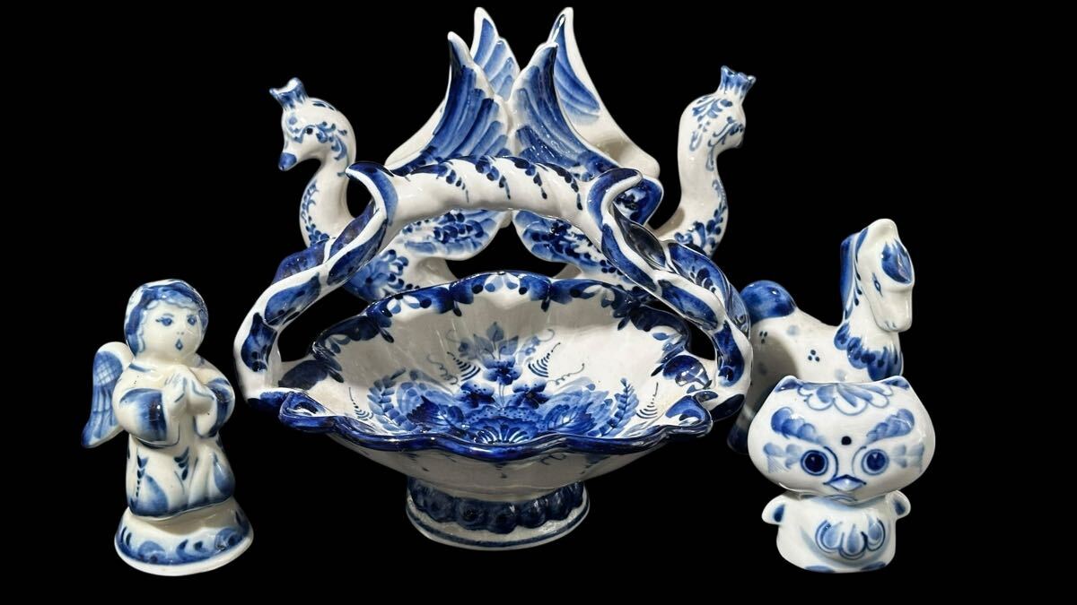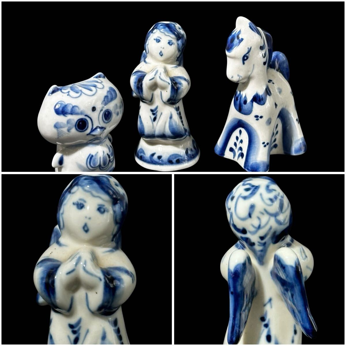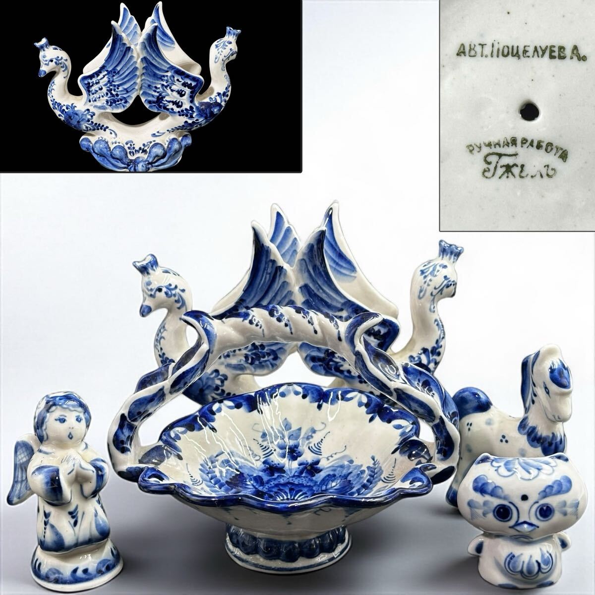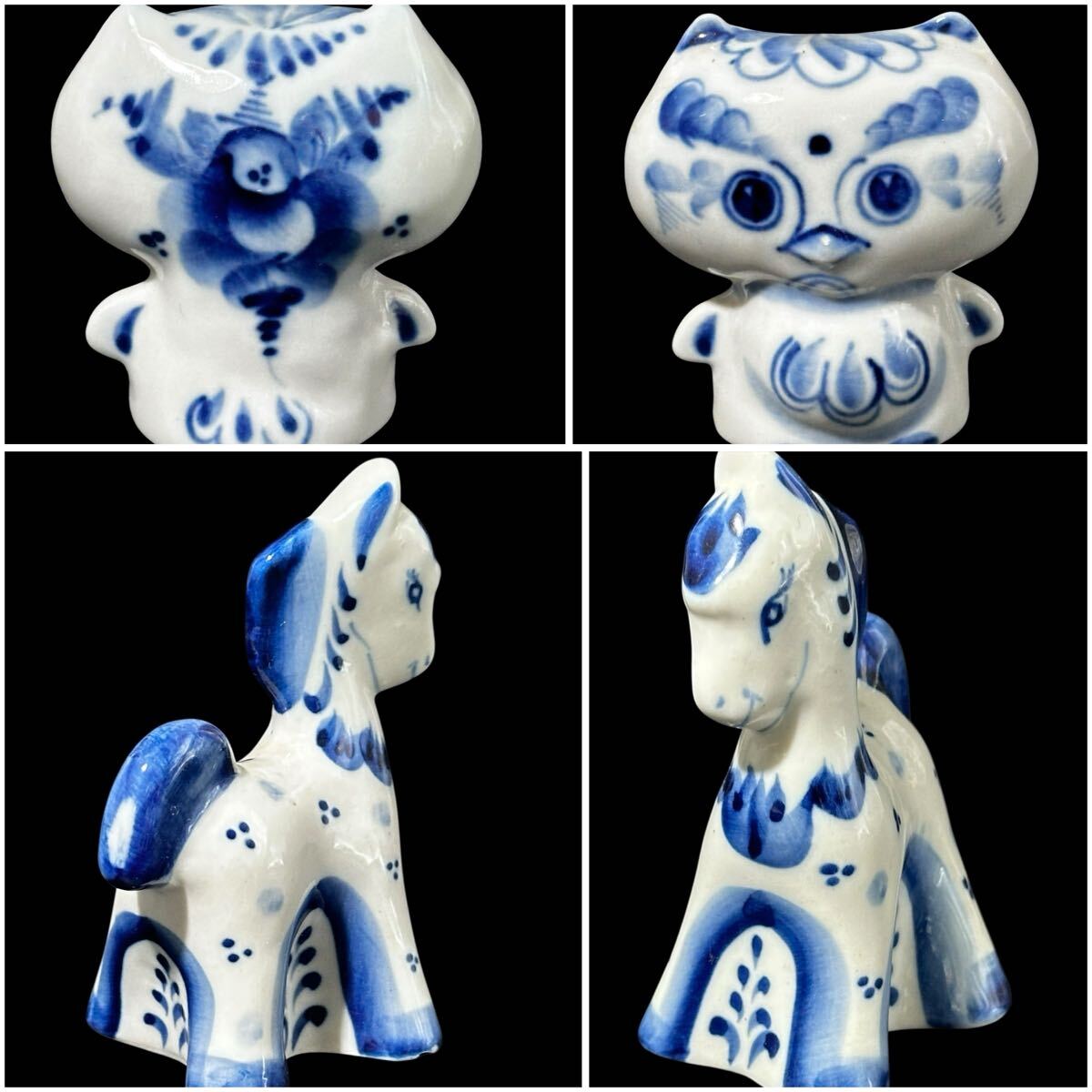 【商品の説明】ロシア民族陶芸 グジェリ焼 セット 花形皿 白鳥 子馬 天使 フクロウ 置物 洋風インテリア オブジェ ペテルブルグ お土産品