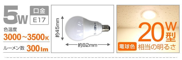 | 安心の1年保証付き! ECO!省エネ&長寿命のLED電球! 落ち着いた雰囲気の「電球色」タイプです。 白熱電球・電球形蛍光ランプに近い光の広がりで しっかり照らします。 ご使用中の照明をLEDに変えるだけで、節電効果がUP! さらに約40000時間もの長寿命!!長時間使う部屋や、取り替えにくい所にオススメです。 発熱量が少ないので、光の下にいても暑くありません。 また、LEDの光は、赤外線や紫外線をほとんど含まず、紫外線による色あせなども抑えます。 白熱灯と比べると電気代もかなりお得です♪ ■商品仕様 ■口金:E17 サイズ(約):全長82mm×最大径45mm 消費電力:5W電圧:AC90~130V 50/60HZ 寿命:約40,000時間 ※表示寿命は設計寿命であり、製品の寿命を保証するものではありません。 色温度:電球色 3000~3500K 全光束:電球色 300lm 材質:アルミニウム、PC樹脂 PSE取得品 ■商品内容■ LED電球 E17 5W 電球色×1 ■注意事項■ ・取付・取外しは必ず電源を切った状態で行なってください。 ・ランプはソケットに確実に取り付けてください。 ・リモコンタイプの照明器具は調光器に対応しておりません。・断熱材施工器具と密閉器具にはなるべく使用しないでください、使用寿命の減少の原因になります。・周囲温度が40℃を超える場所や腐蝕性環境では使用しないでください。 ・直流電源では使用しないでください。・点灯中・点灯直後は直接手でふれないでください。 ・水洗いや分解・改造はしないでください。水滴などがかかる場所では使用しないでください。 ・紙や布などでおおったり、燃えやすいものに近つけないでください。(火災、器具過熱の原因) ・電源を入れた状態や電源を切った後しばらくの間は、ランプが熱いので触れないでください。(ヤケドの原因) |