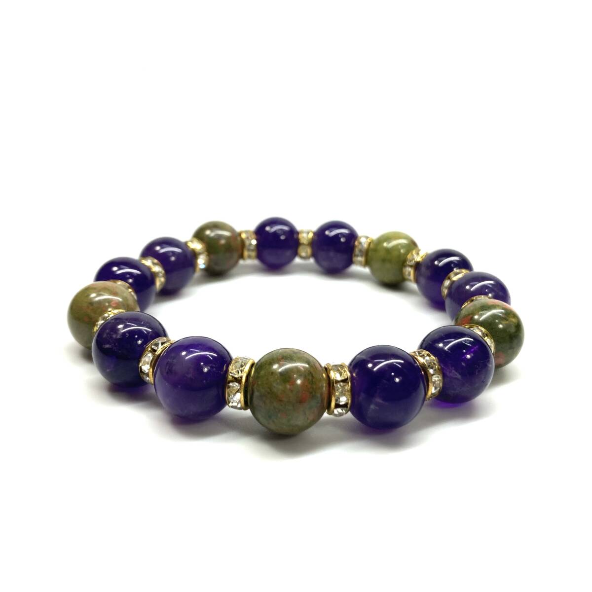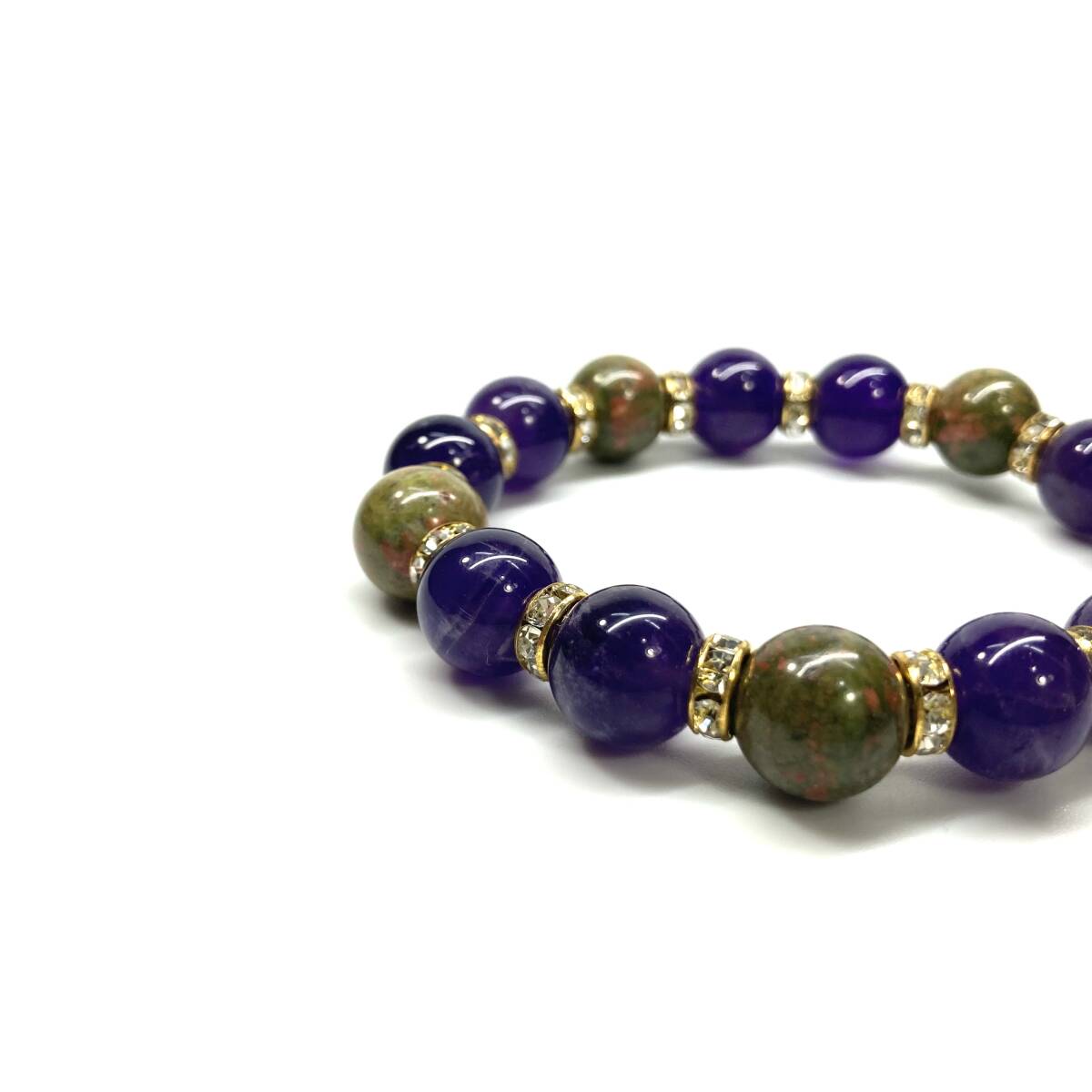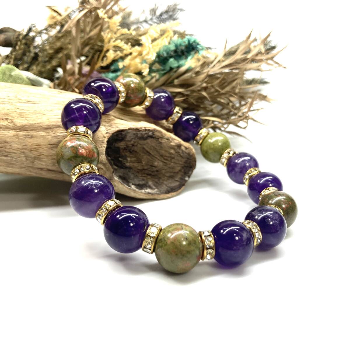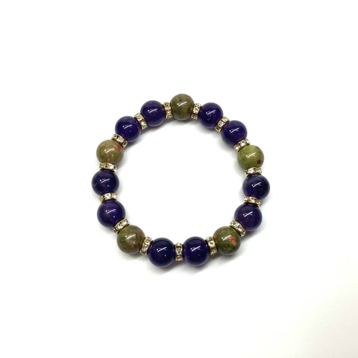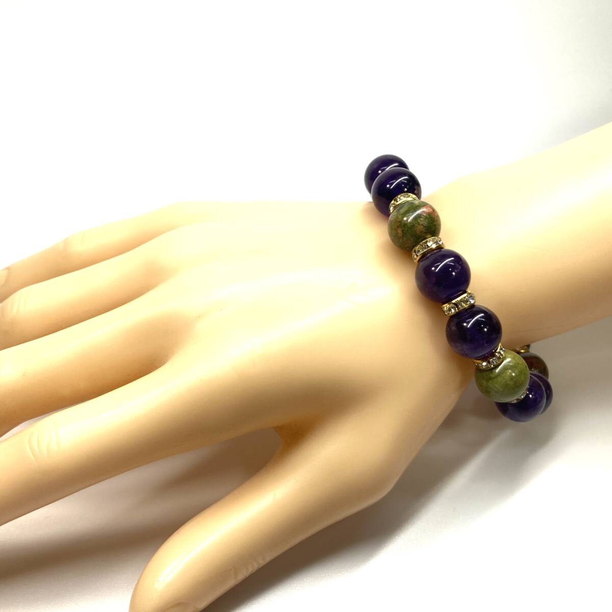 こちらは、ユナカイトとアメジストを組み合わせたパワーストーンブレスレットです。間にはロンデルを挟み高級感あるデザインに仕上げております。石大きさは12mm玉を使用して内周約18cmです。気になる方は是非この機会にどうぞ。