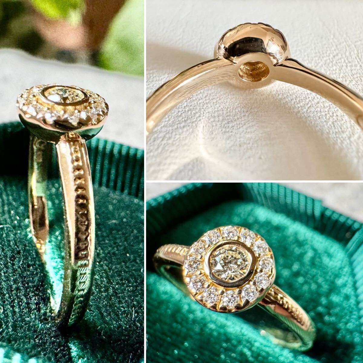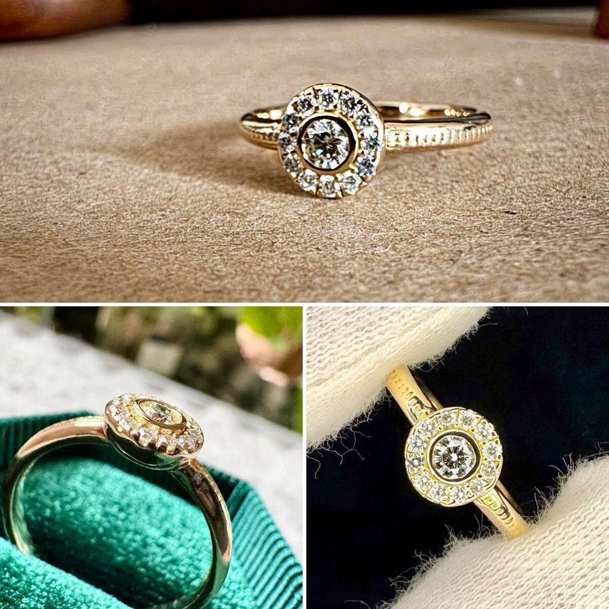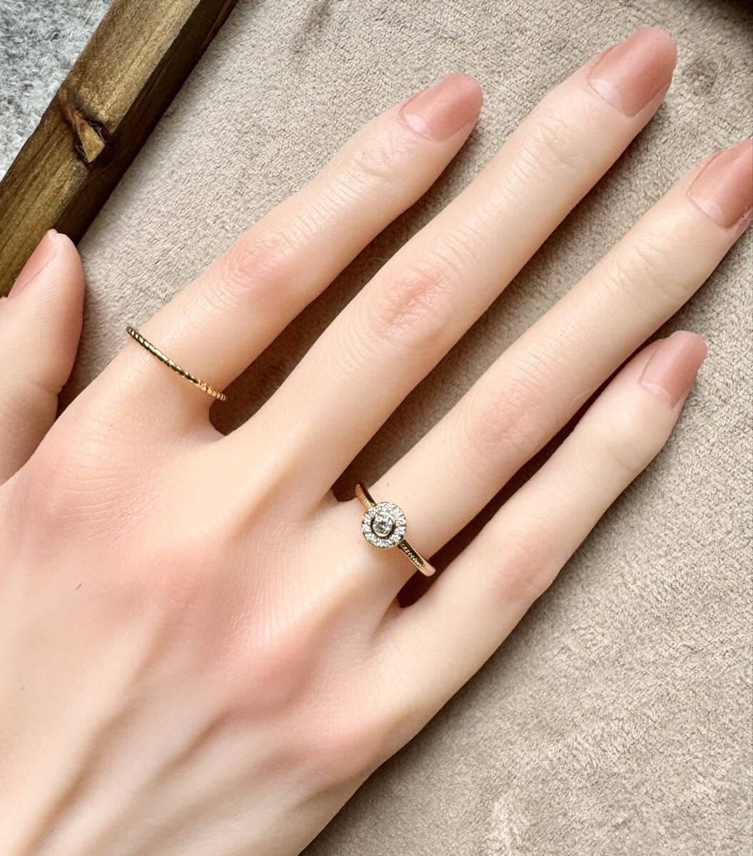 センターには約3㎜のダイヤモンド、それを取り巻くようにぐるりと一周メレダイヤモンドがセットされています。