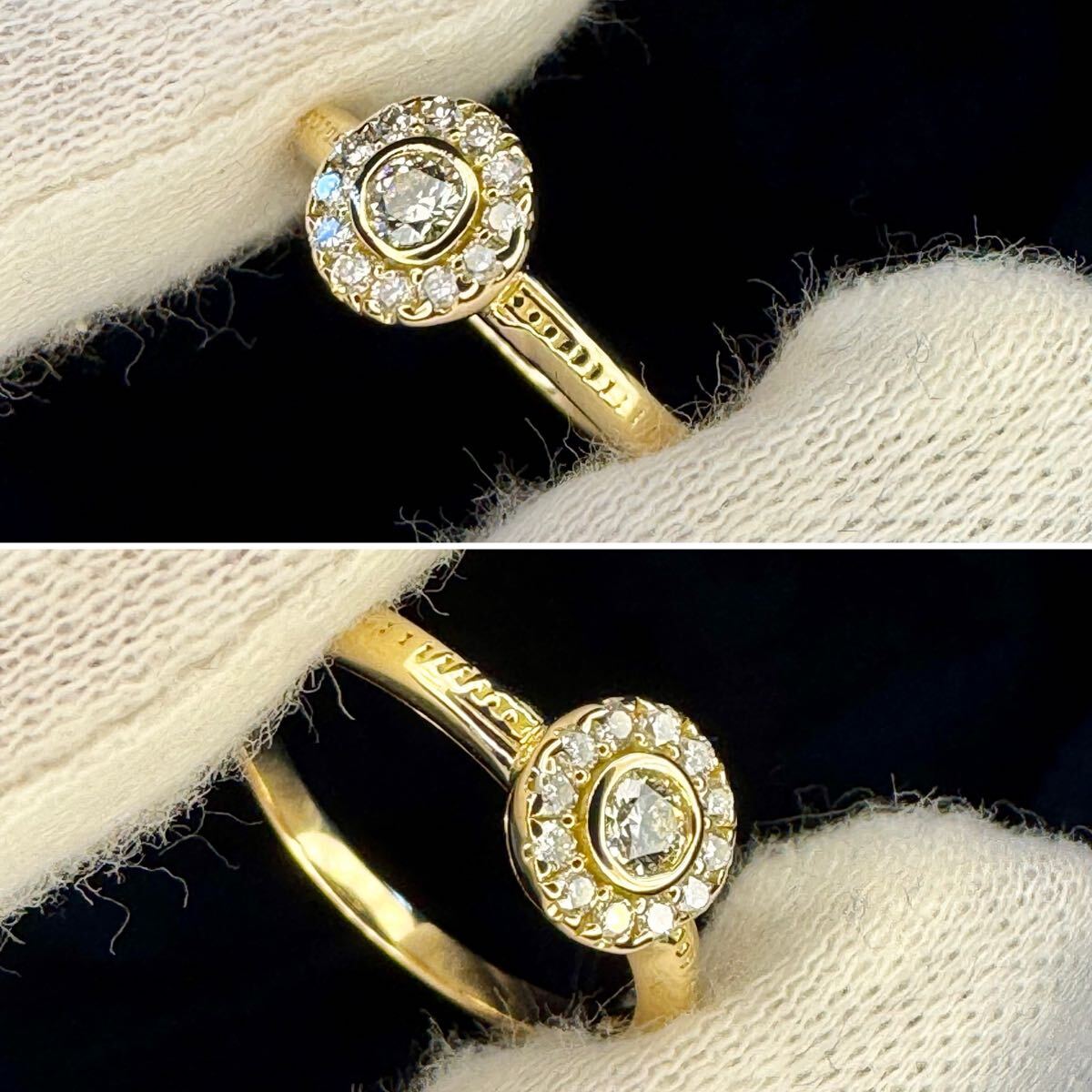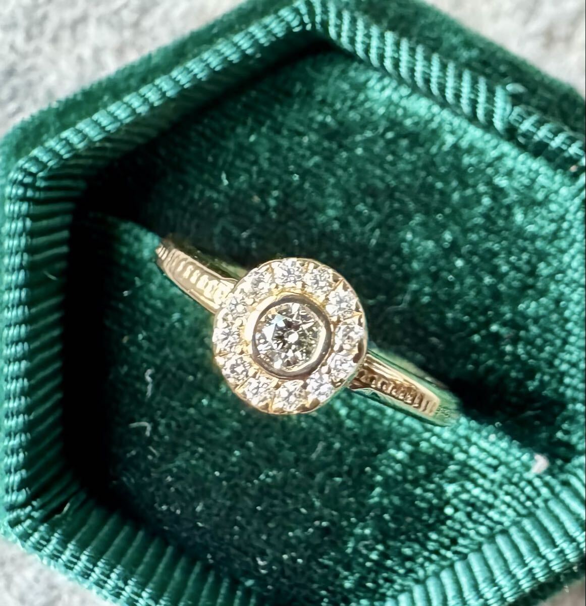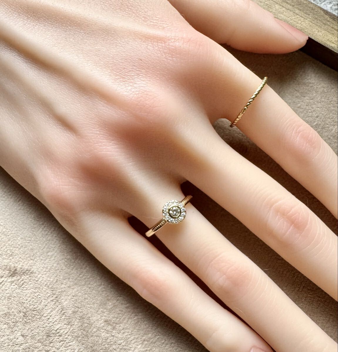 センターには約3㎜のダイヤモンド、それを取り巻くようにぐるりと一周メレダイヤモンドがセットされています。