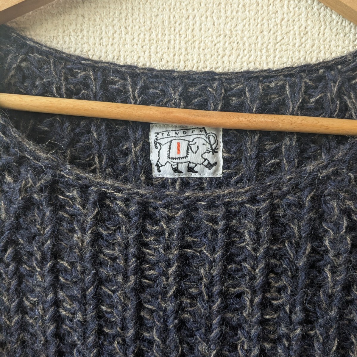 ローゲージのざっくりとした編み、ネイビーにグルー系のミックスカラー、ハンドニットのとても風合いのよい一着です。同ブランドのデニムと同様に、オーセンティックなスタイルながら確かにこだわりを感じる長く愛用できるものだと思います。