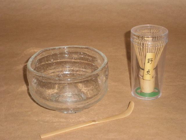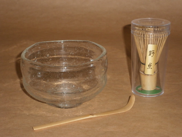 ★抹茶碗・野点用茶碗・吹きガラス製・クリアー★ 冷抹茶碗・野点茶筅・茶杓付き。