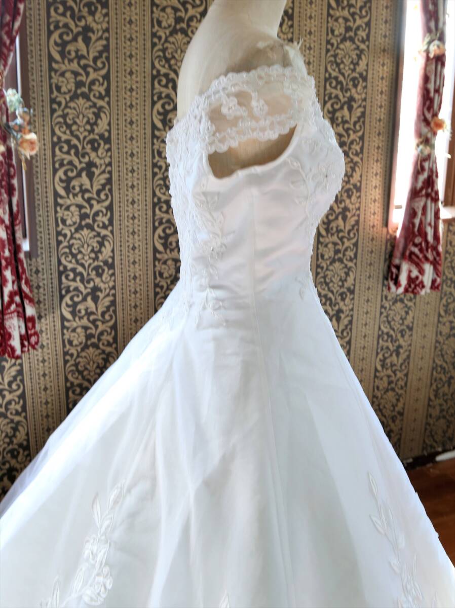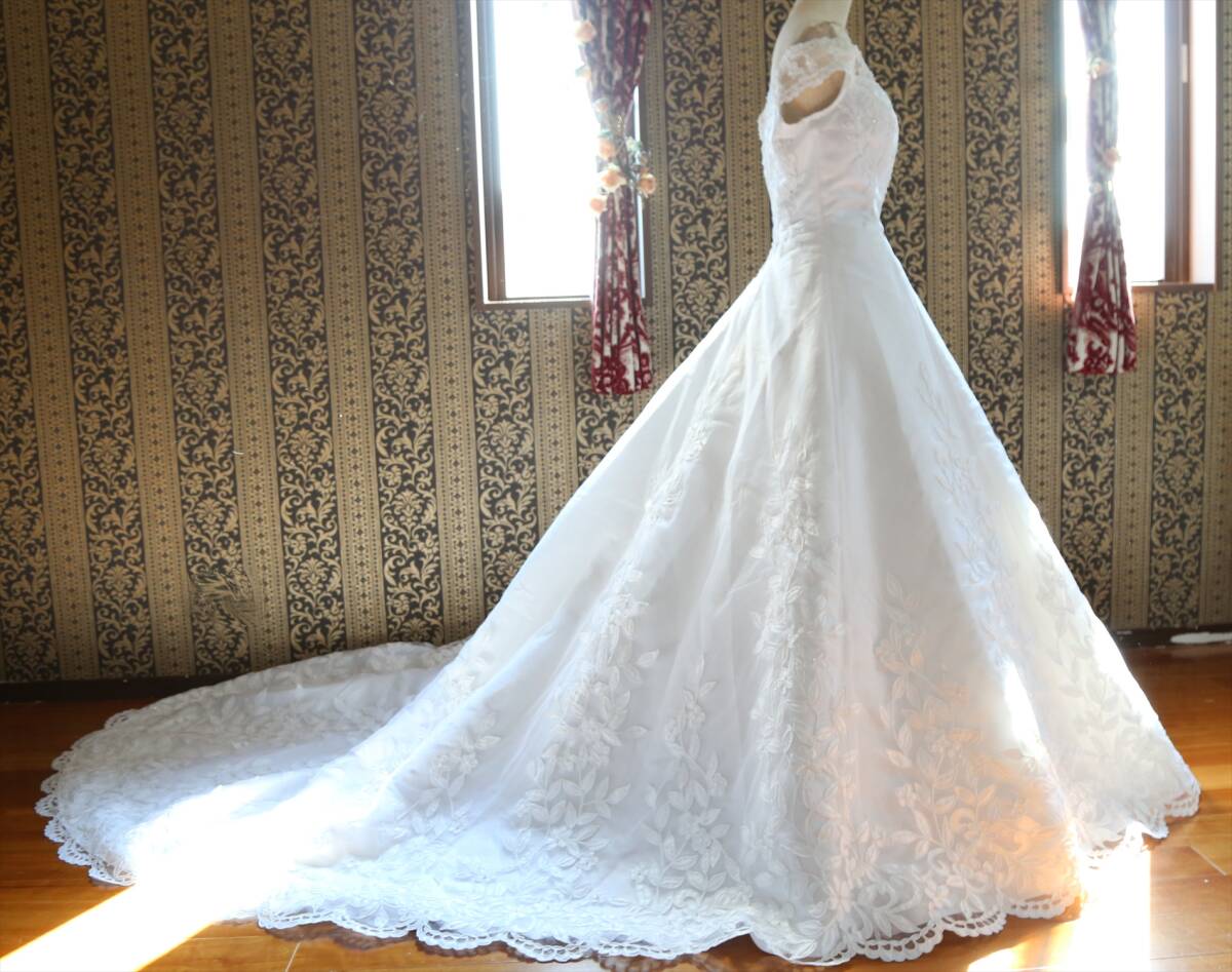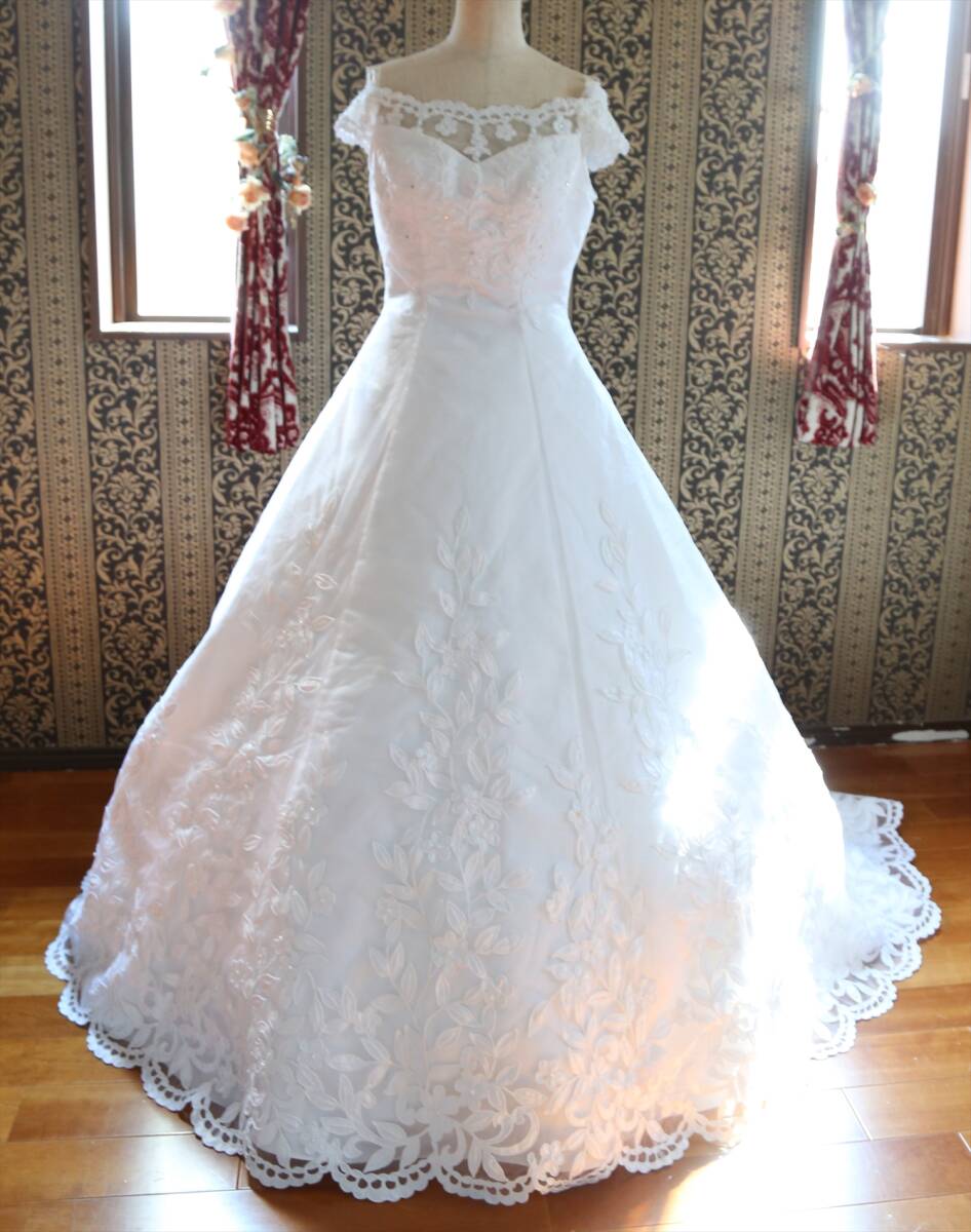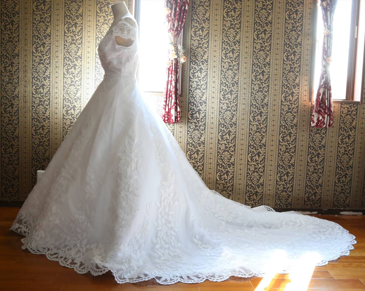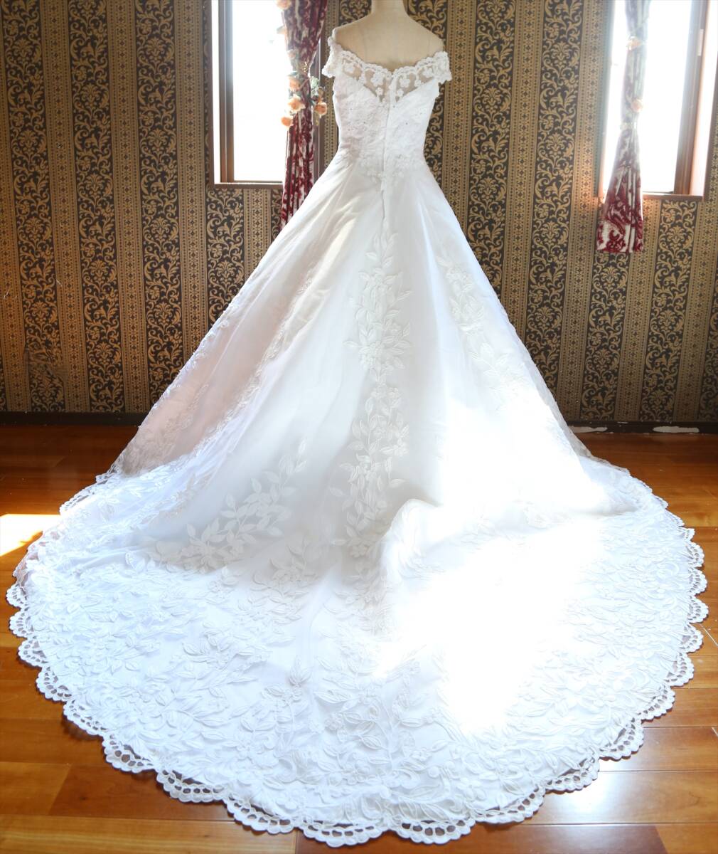 露出控えめコードレース装飾された純白の高級ウエディングドレス9号Mサイズロングトレーン