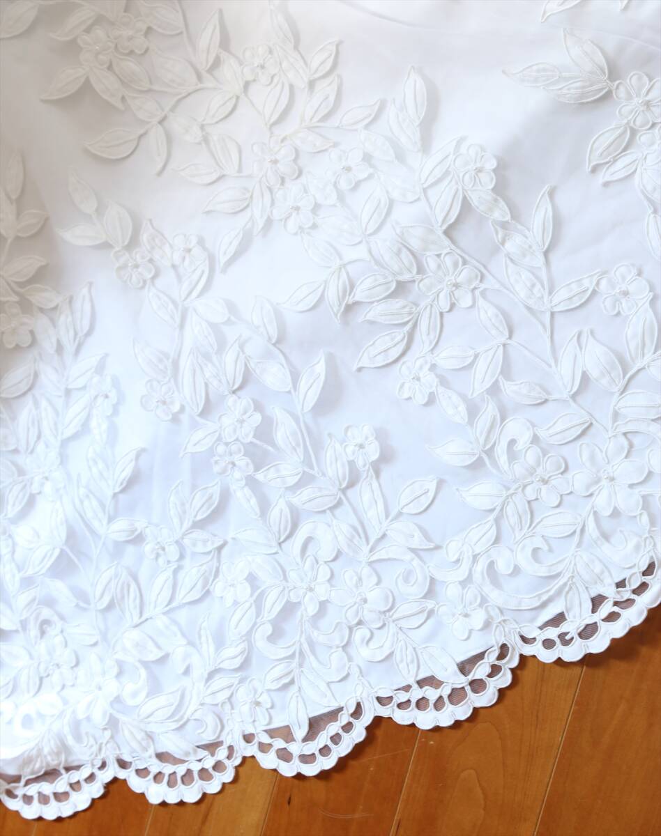 生地はミカドサテン生地の上にチュール生地を重ね、コードレーなどで装飾されています