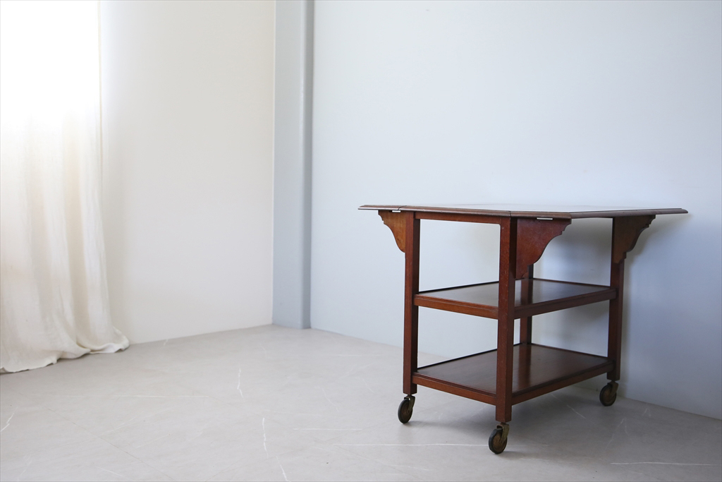英国アンティーク◇木製ドロップリーフトロリーテーブル/収納式ワゴン/折畳式机/飾り棚/店舗什器/ディスプレイ台/イギリスビンテージ家具
