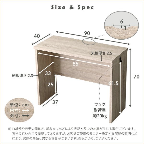 | 【ポイント】 子どもから大人まで使えるリビングに合うシンプルデスク90cm幅です。 教科書&ノートを広々置ける学習机に! 趣味や家事のワークスペースとしても使えます。 しっかりした厚みの天板はキズや書き跡に強いPVC仕様です。 デスクのサイドにはランドセルやバッグが掛けれるフック付きです。 デスクの背面にはライトやパソコンのコードを通せる隙間を作っているので、スッキリ収納できます。 |