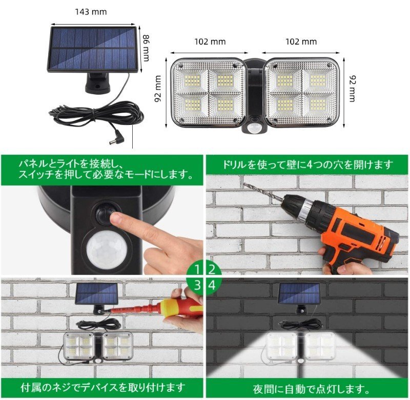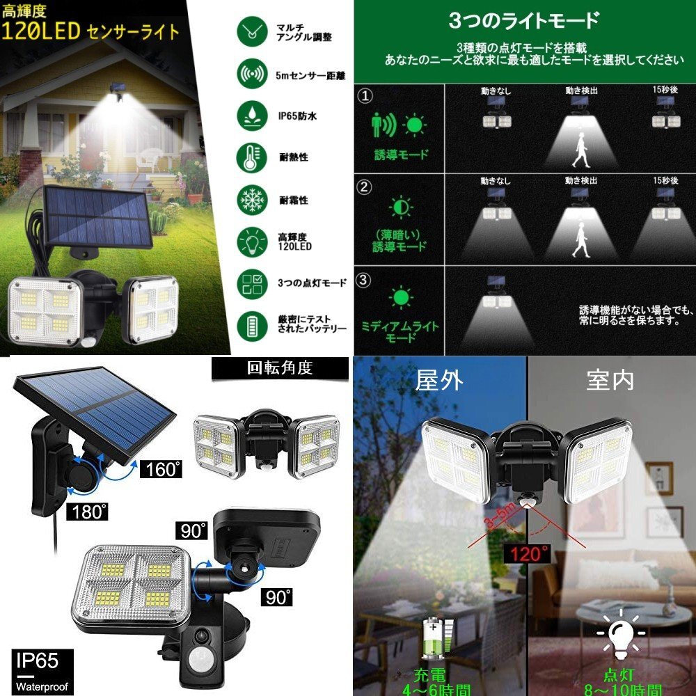 【vaps_3】120LED センサーライト 高輝度 ソーラー 3灯モード 人感 モーション検知 IP65防水 屋外照明 ガーデンライト 送込