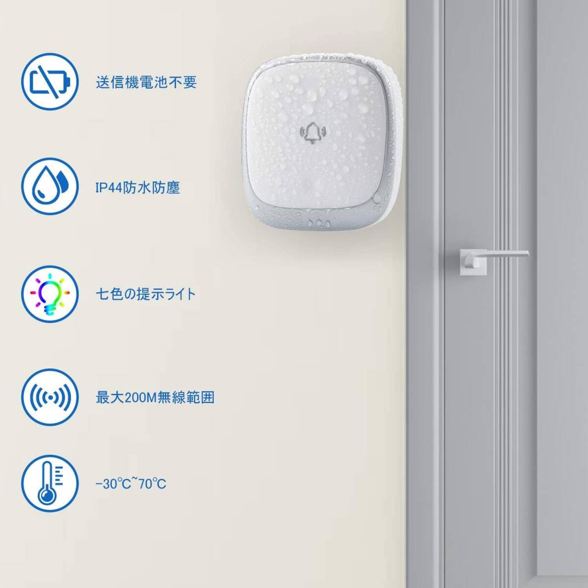 耐久性抜群 ワイヤレスチャイム 自動発電 防水防塵 7色LED提示 200M無線