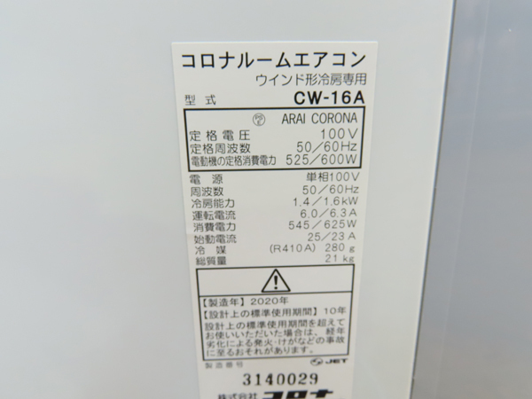 コロナ・窓用エアコン・2020年製・CW-16A・ルームエアコン・152033