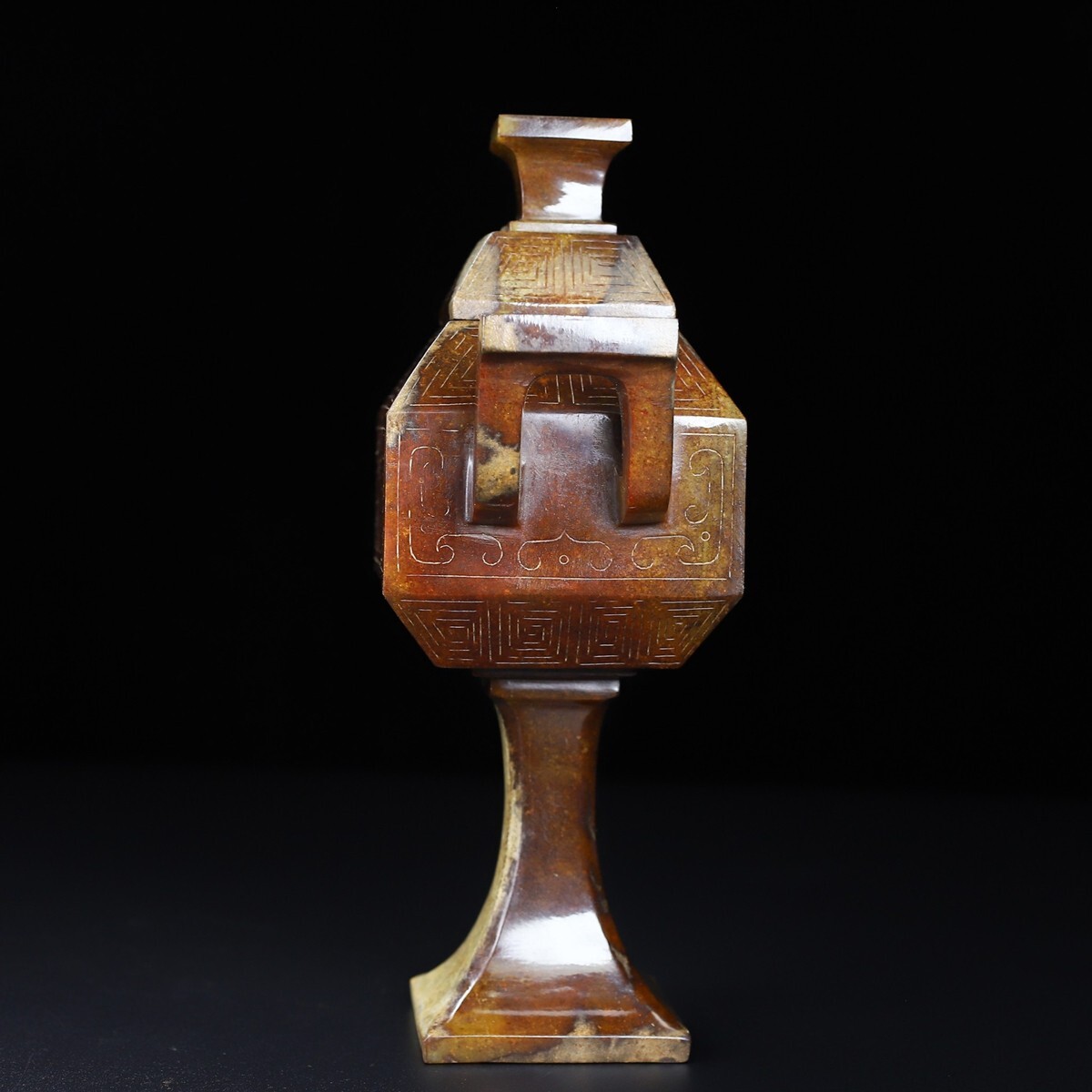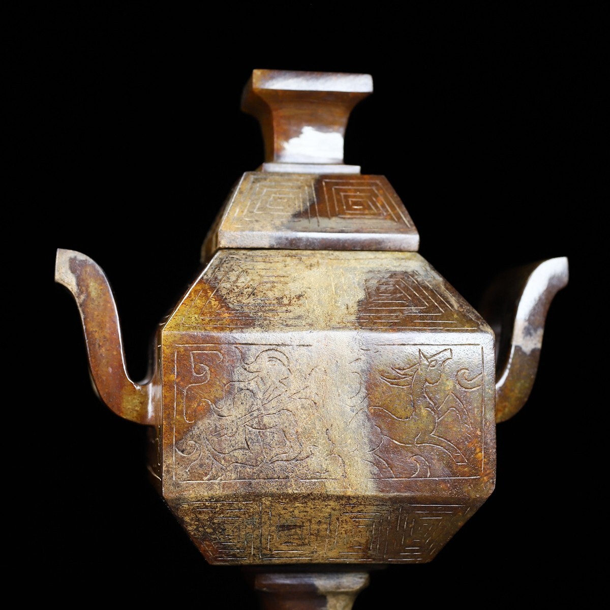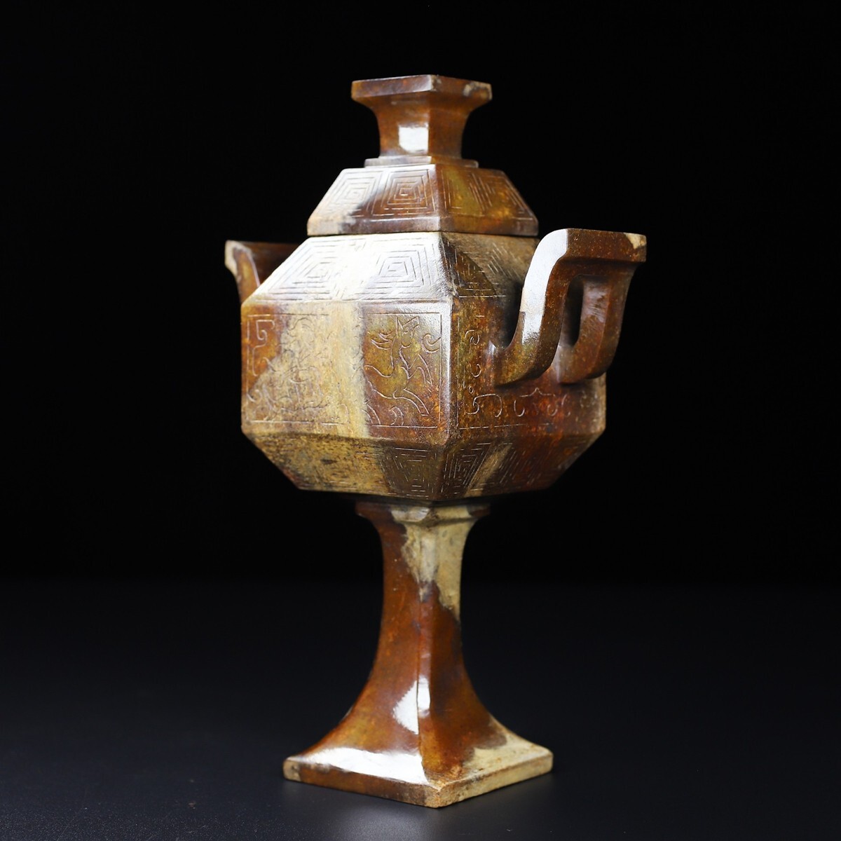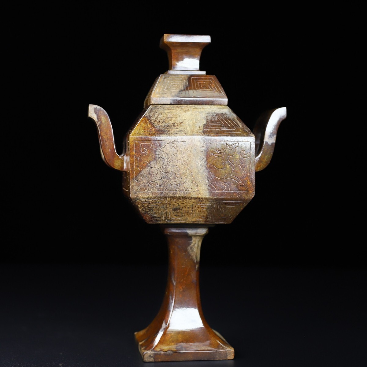 「戦國時期 和田玉 高古玉彫り 狩猟紋 冠耳玉炉」極細工 賞物 中国古美術 旧蔵出
