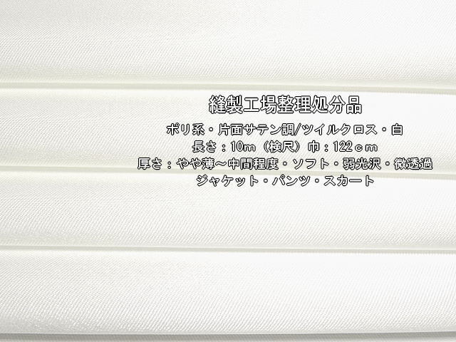 商品説明 | 縫製工場様からの整理・処分品の激安処分です。 商品知識は御座いませんが、大量の余財を処分させて頂きます。 商品は、ポリ系・片面サテン調/ツイルクロス 色調は、白でございます。 長さは、10m(検尺)巾は、122cmです。 厚さは、やや薄~中間程度・ソフト・弱光沢 微透過でございます。 ジャケット・パンツ・スカートなどにいかがでしょうか。 この機会にお試し下さい。 |