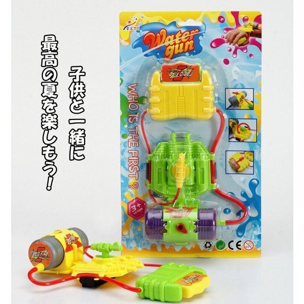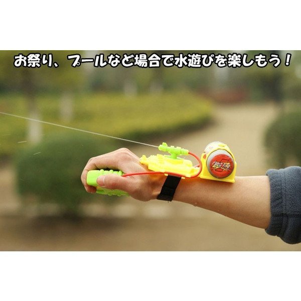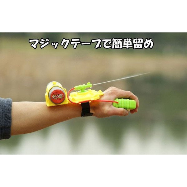 ちょっと珍しい手首装着型グリップ式水鉄砲。お子様との水遊びにいかが。ご家族やお友達と盛り上がることマチガイなし。使い方は簡単。手首にマジックテープで留めるだけ。
