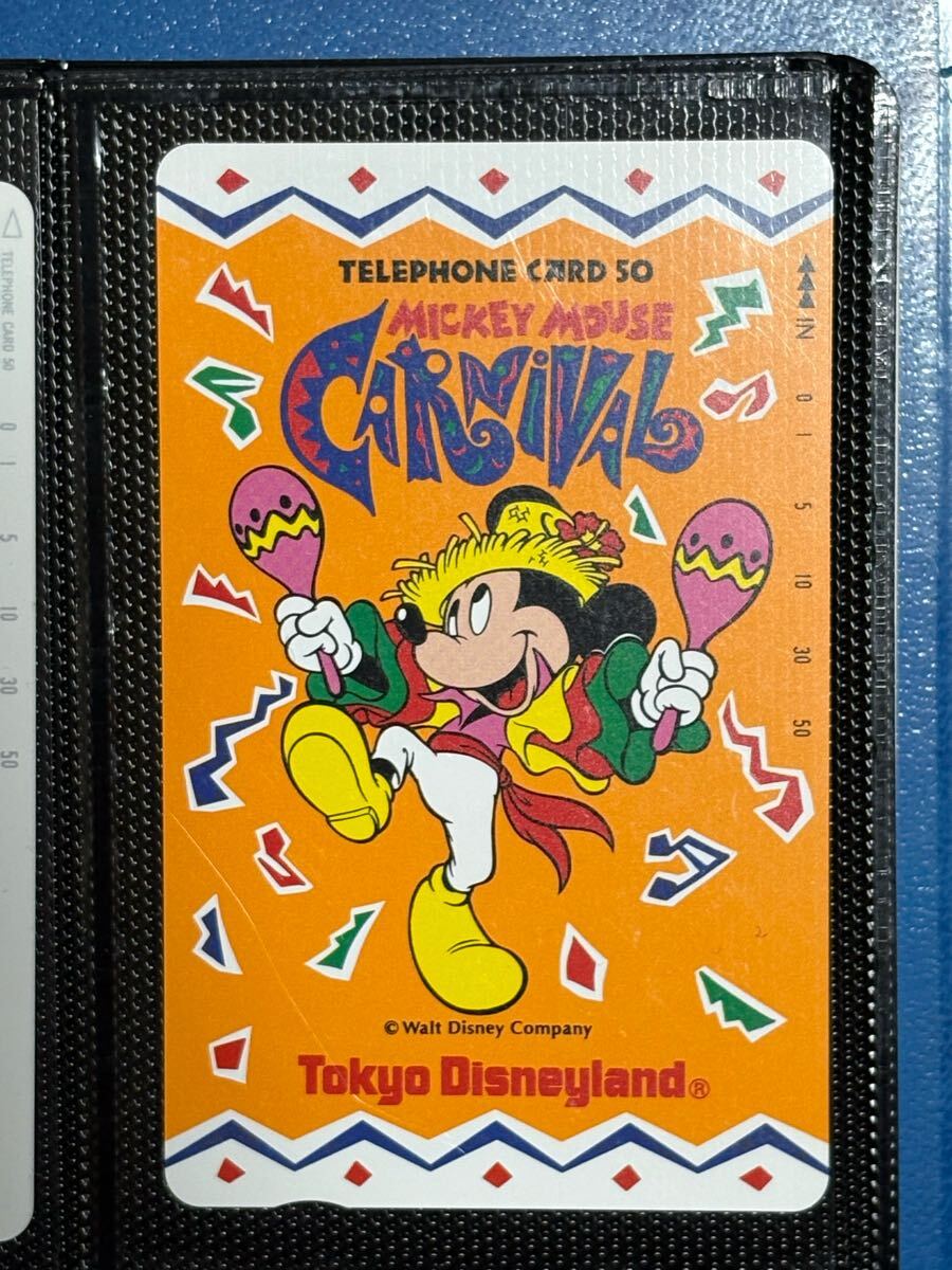 陽気なカーニバル衣装をまとったミッキーマウスが、マラカスを手にリズムよく踊るポップなデザインのテレホンカードです。鮮やかなオレンジを基調にした背景に、カラフルな装飾が散りばめられ、見ているだけで元気になれる一枚。東京ディズニーランドらしいエネルギッシュな雰囲気が魅力のコレクターズアイテムです。