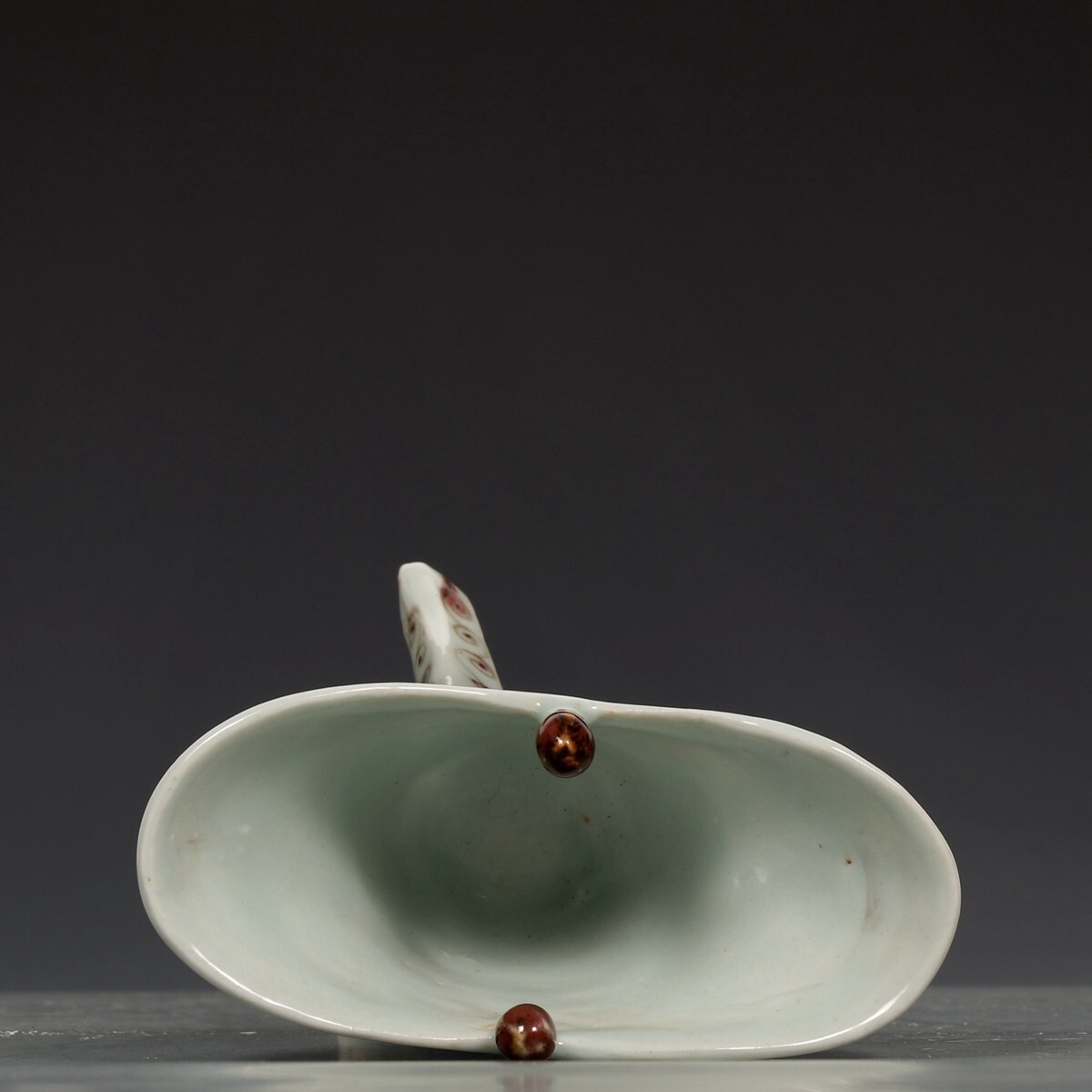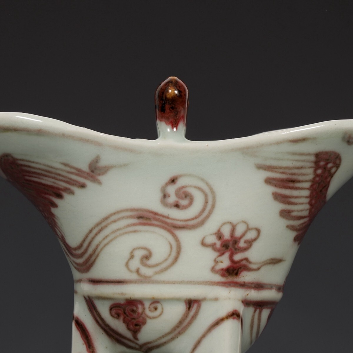 元代 陶磁器 釉裏紅鳳紋 三足 爵杯【仁】染付 置物擺件 古賞物 古美術 中国古玩 蔵出