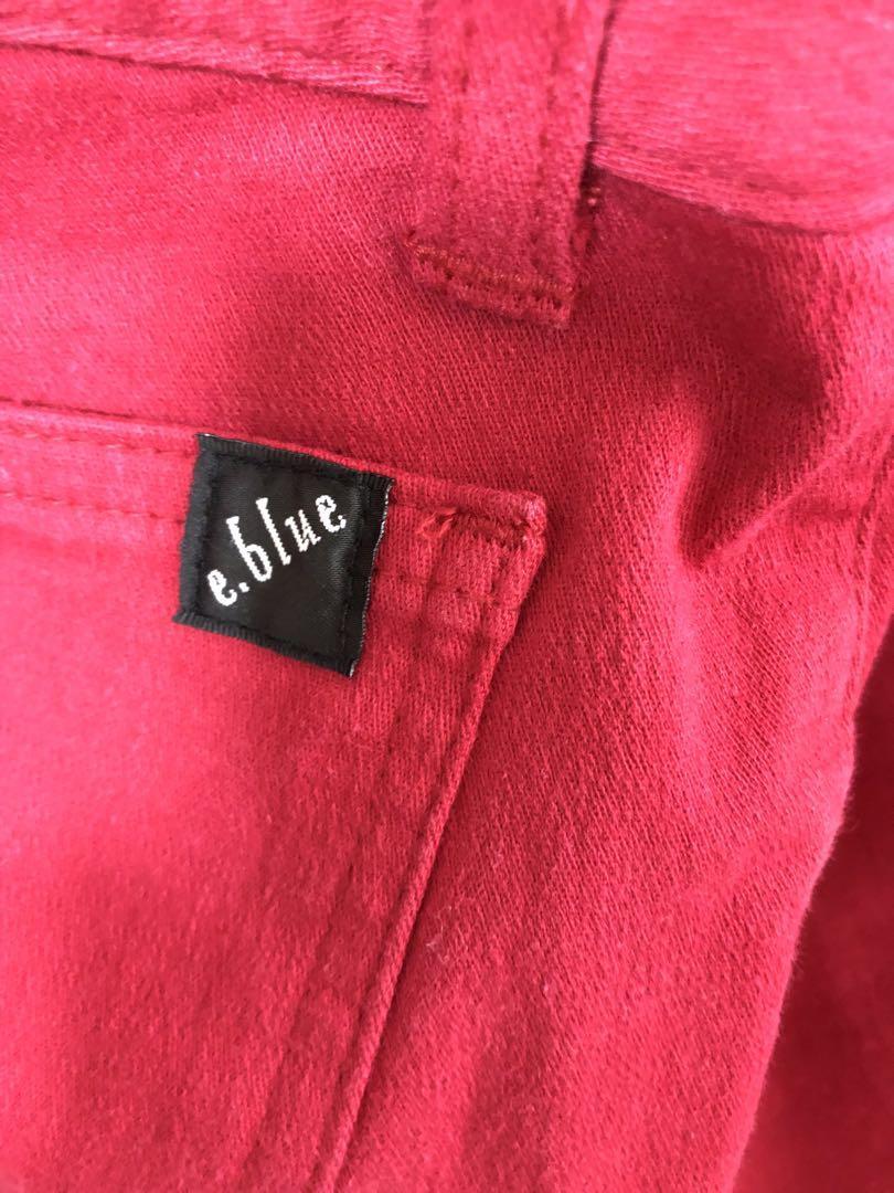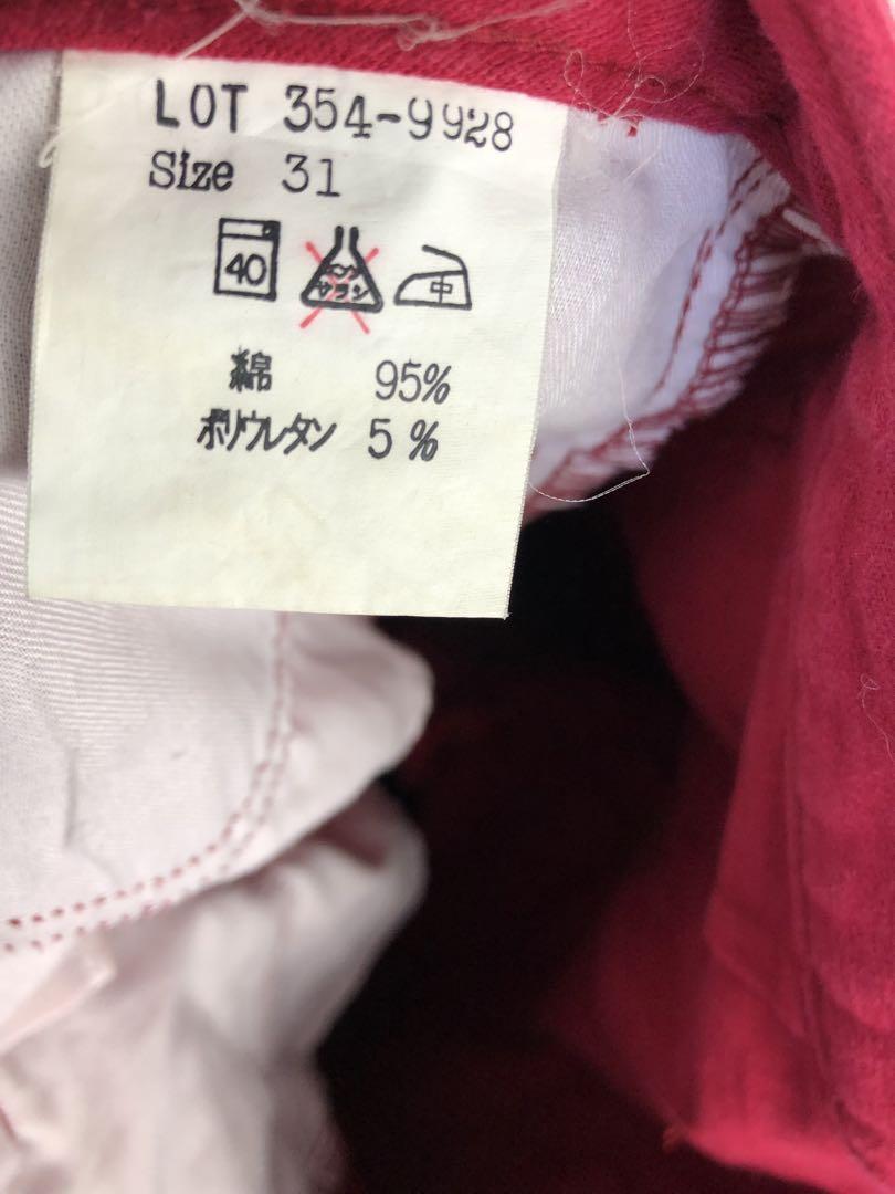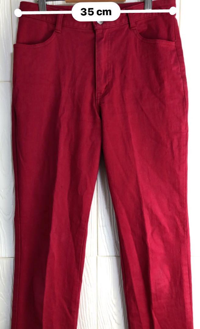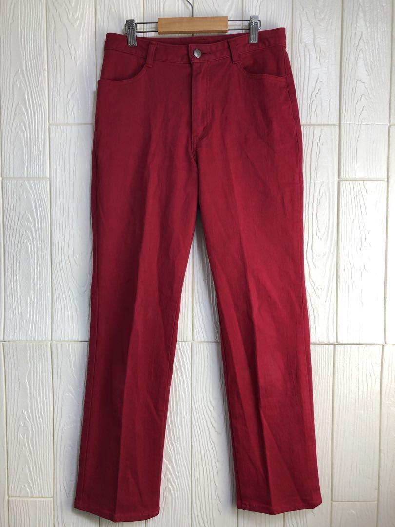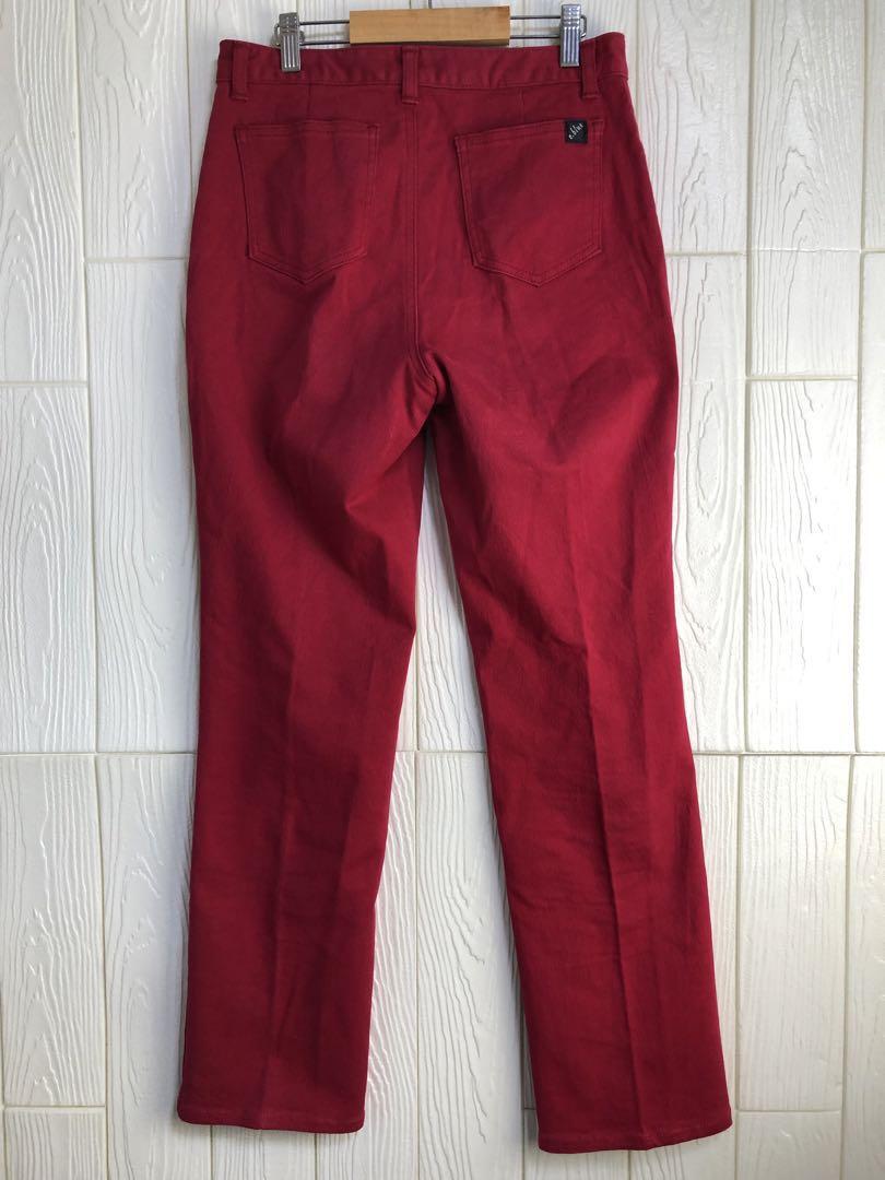 鮮やかな赤色のパンツ、ウエスト70cm、股下75cm、前股上23cmのスタイリッシュなデザイン。