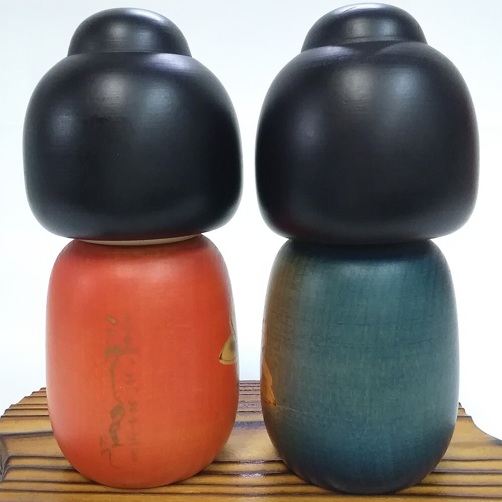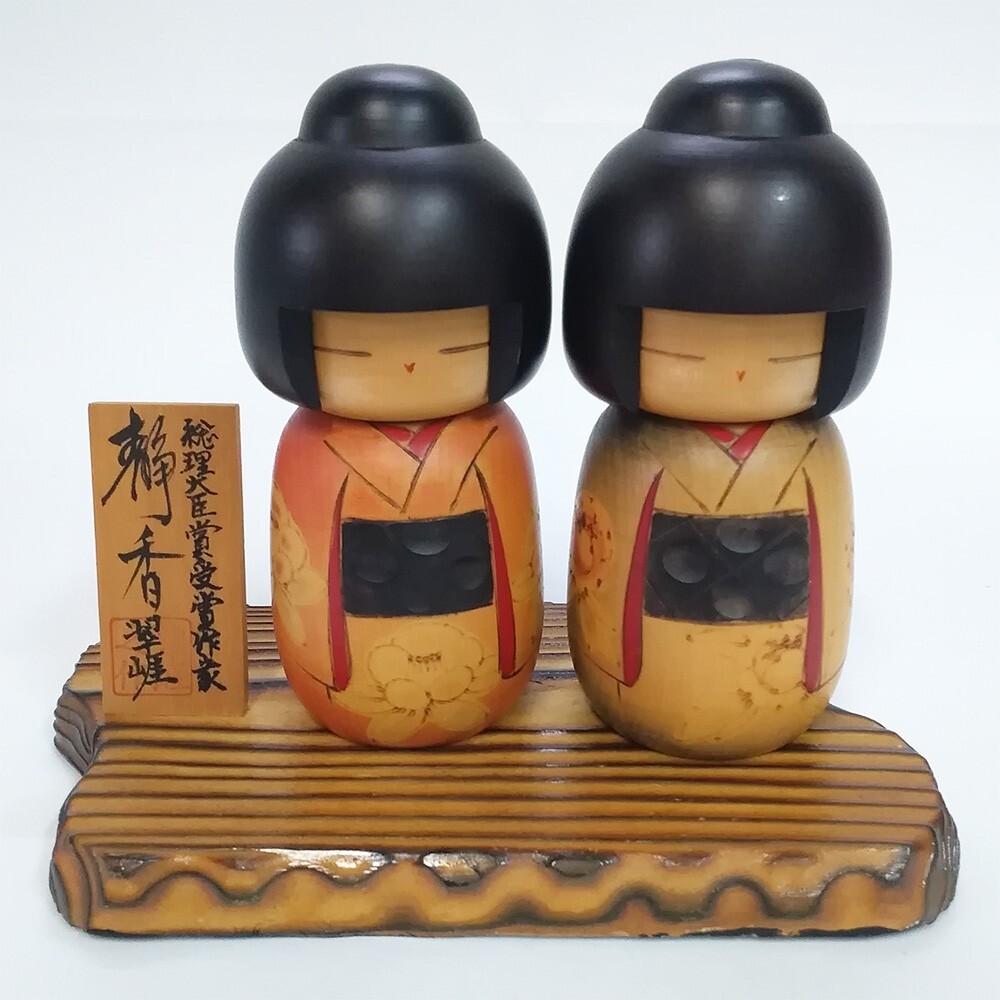 『佐藤翠崕作 創作こけし 静香 こけしの里にて』 中古品です。 こけし2点、台座、立て札 合計4点となります。
