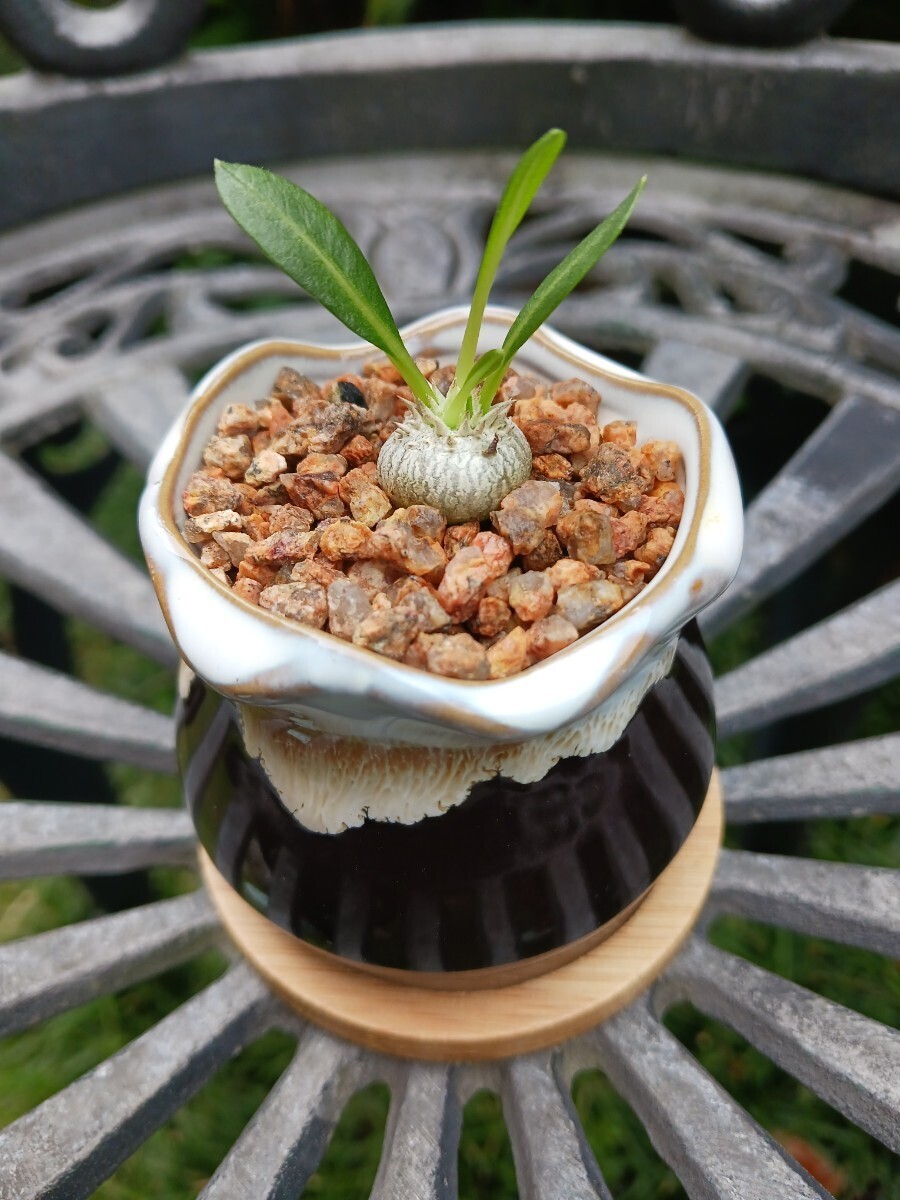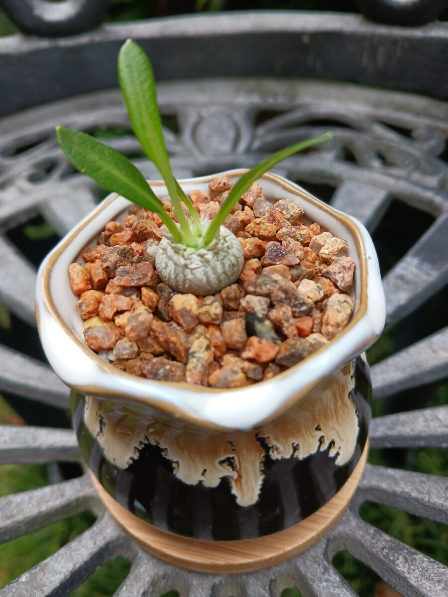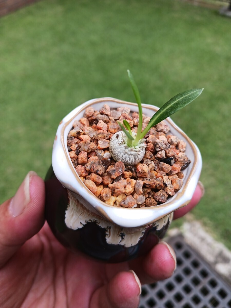 鉢のサイズ、高さ約55ミリ、直径約65ミリの陶器鉢に植えて管理しています。