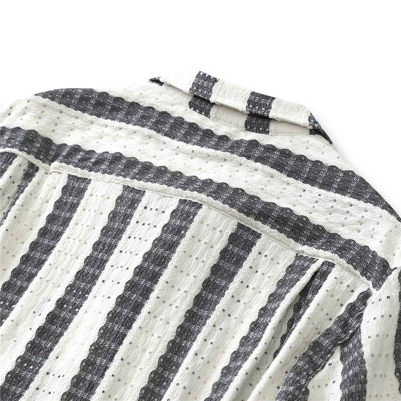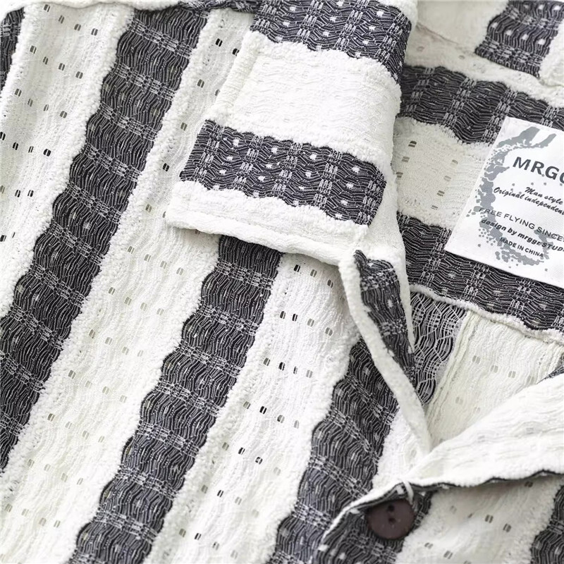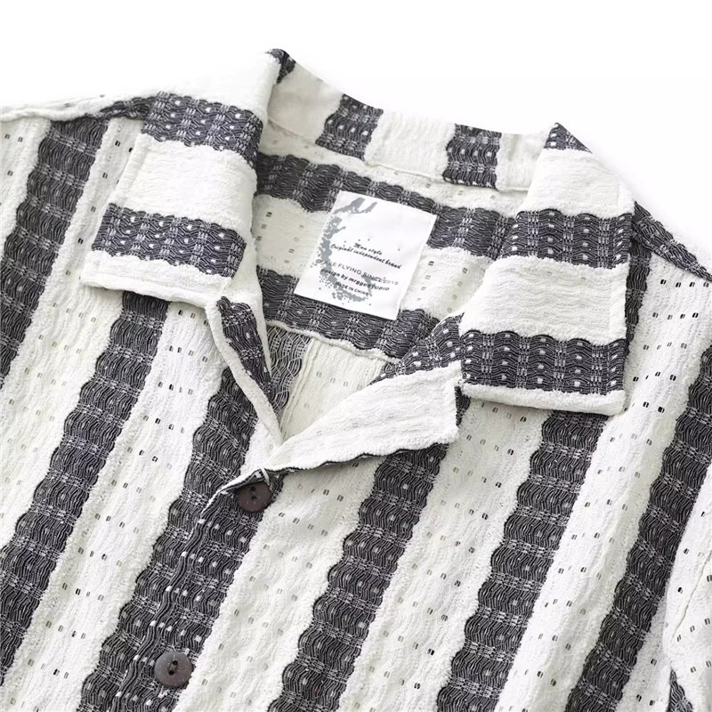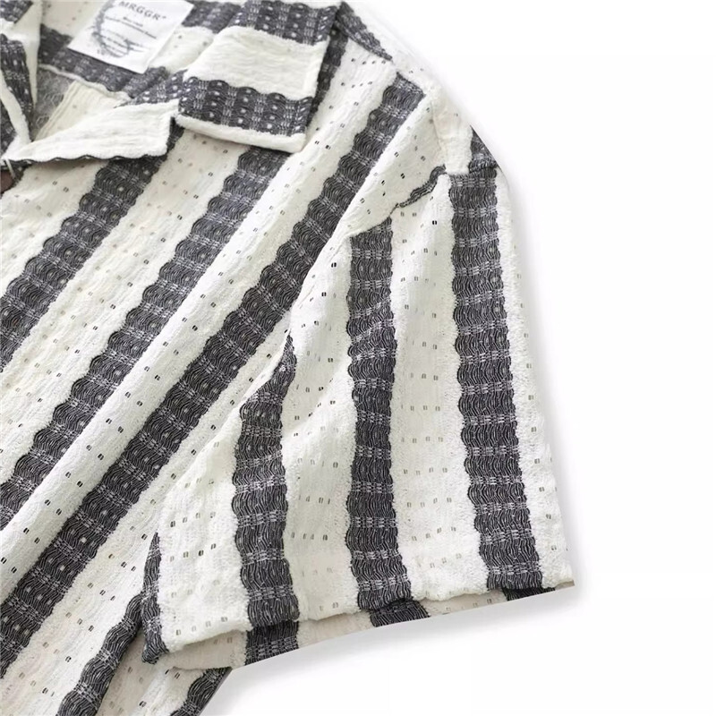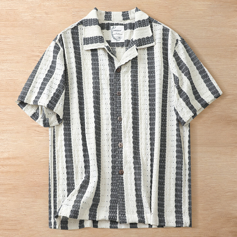 透け感のあるジャカード織りのストライプ柄が特徴的な、開襟デザインのメンズ半袖シャツ。