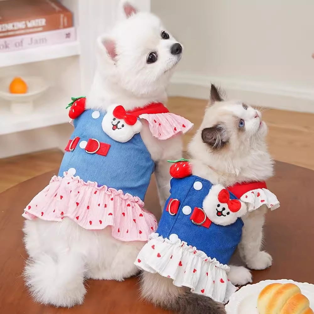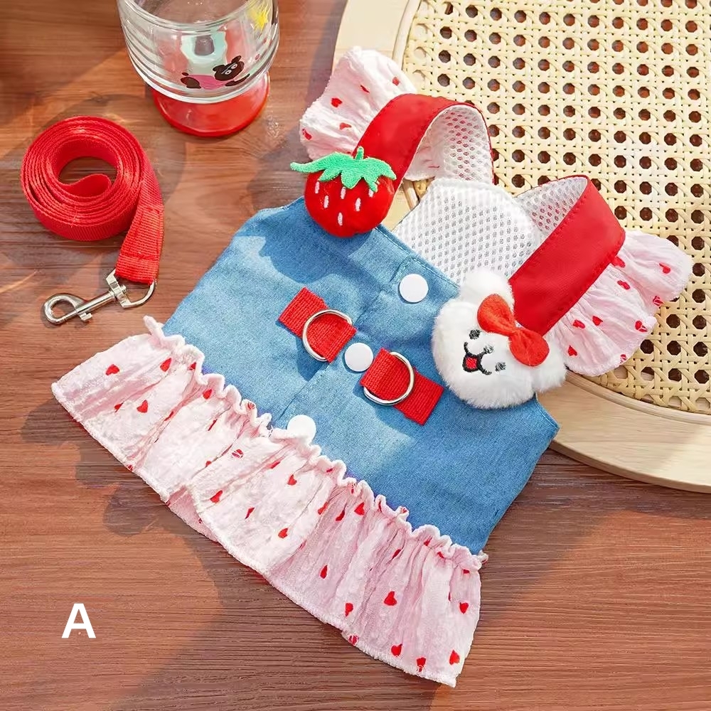 胸当てリード付き2点セット 春夏用 薄手デニム風プリンセスドレス&ハーネス付きリード 犬 猫用 小型犬 イチゴ&ぬいぐるみデザイン 通気性 | |||