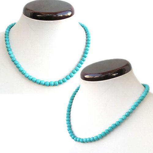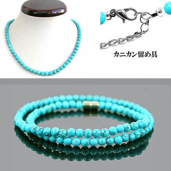 商品サイズ | 【サイズ】カニカン:全長約41cm(アジャスター5cm) 【素材】リコンストラクテッド・ターコイズ(染色)写真は4mm玉を使用しています。 |