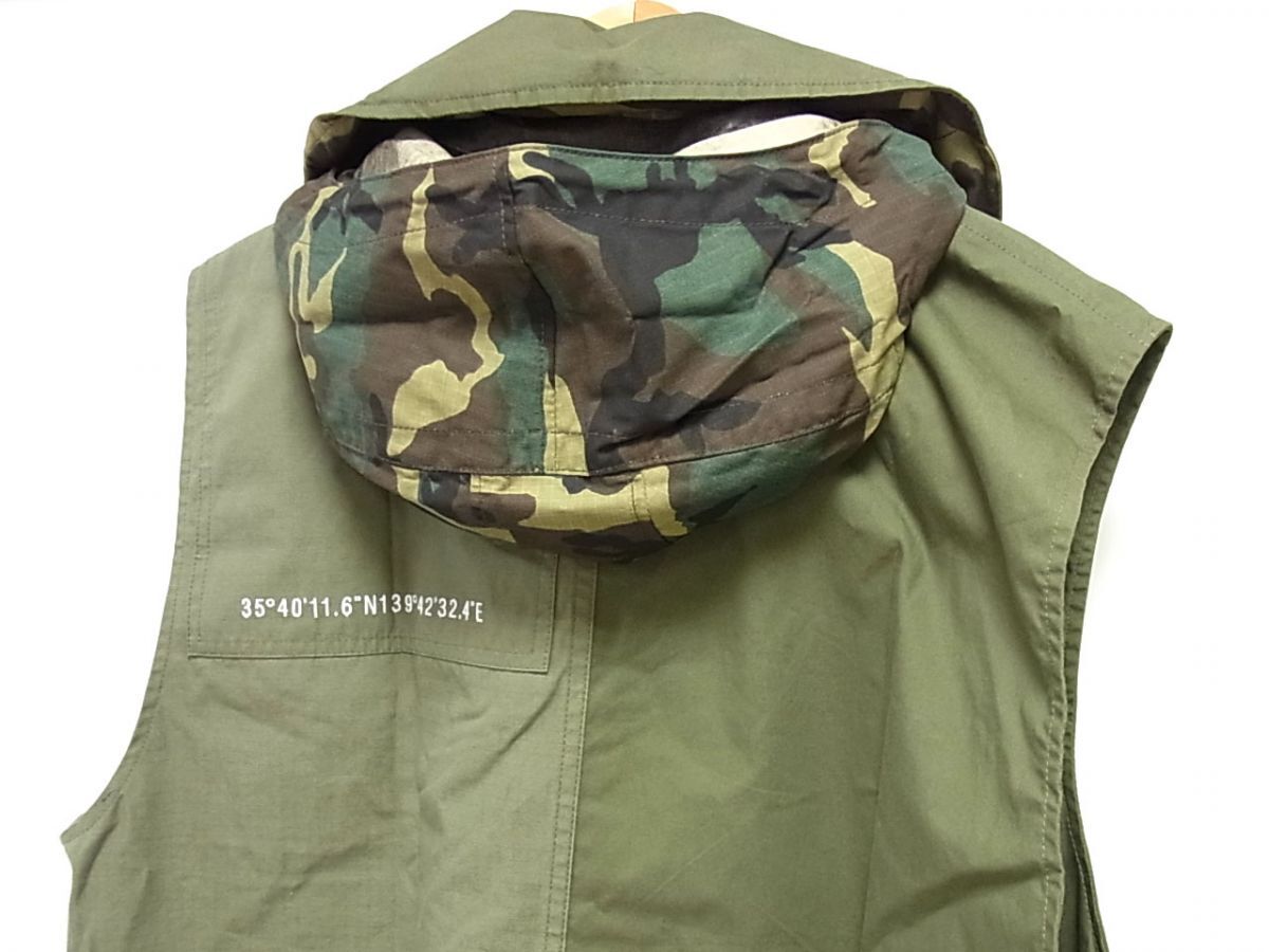 右身頃に高密度アンティークウェザー、左身頃にリップストップ、裏襟とフードにはカモフラージュ柄のリップストップを使用したベスト。