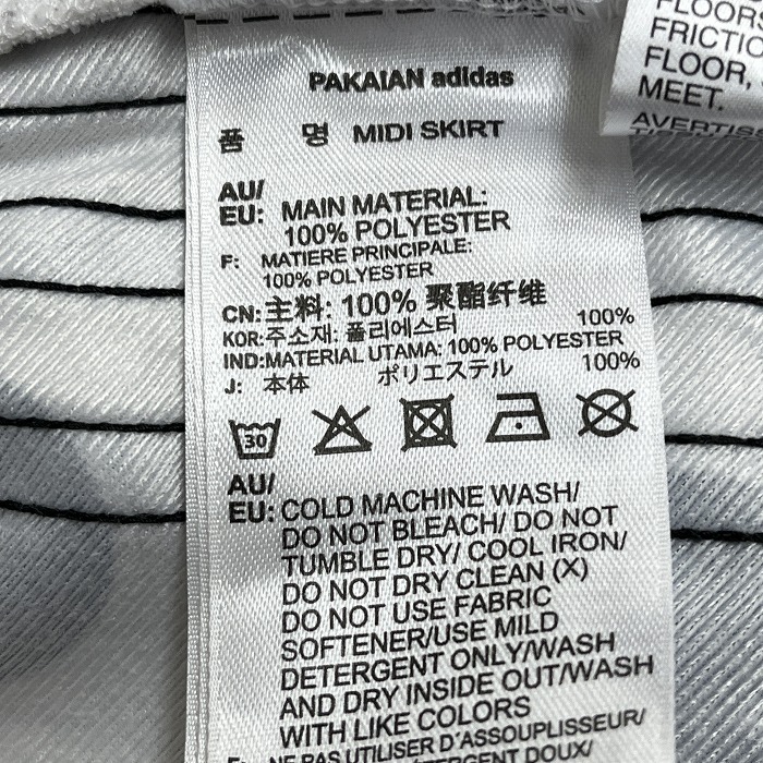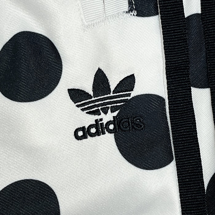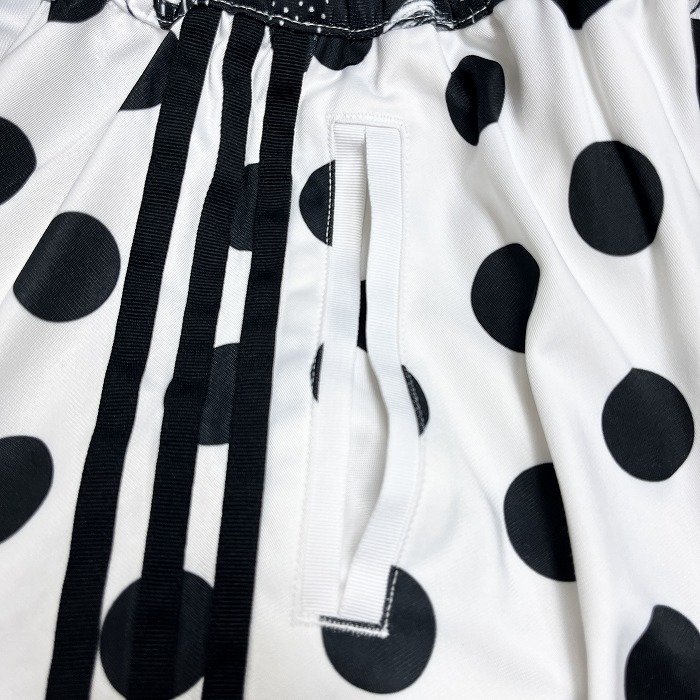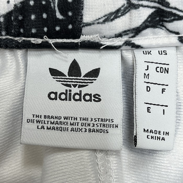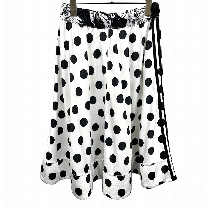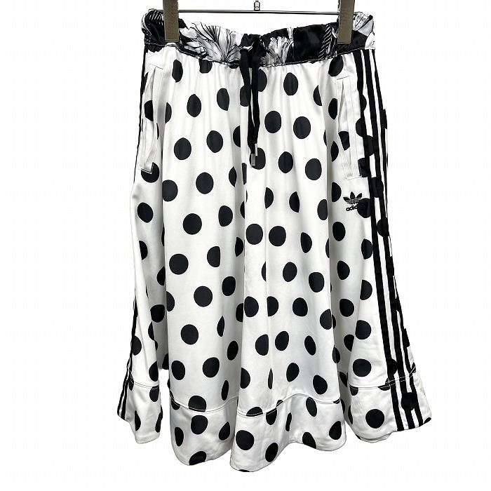 | 商品タイトル | adidas TREFOIL スカート ジャージ系の生地 ウエストに花柄 ドット柄 ウエストゴムと紐 フレア ポリ100% M ホワイト 白×黒 レディース |