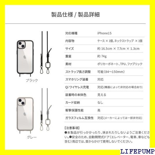 【製品仕様】… ◆ 対応機種 : Apple iPhone 15 ( アップル アイフォン15 ) ◆ 内容物 : ケース × 1個、ネックストラップ × 1個 ◆ サイズ : 約 16.5cm × 7.7cm × 1.3cm ◆ 重量 : 約 74g ◆ 素材 : TPU、ポリカーボネート、ファブリック