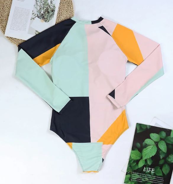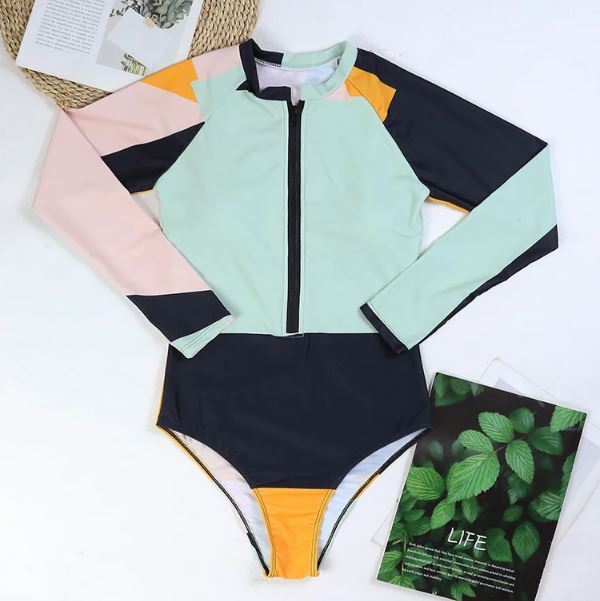 【S~XL】レディース ラッシュガード 長袖 ワンピース水着 パッチワーク ジッパー モノキニ サーフィン ボディスーツ ※NO1