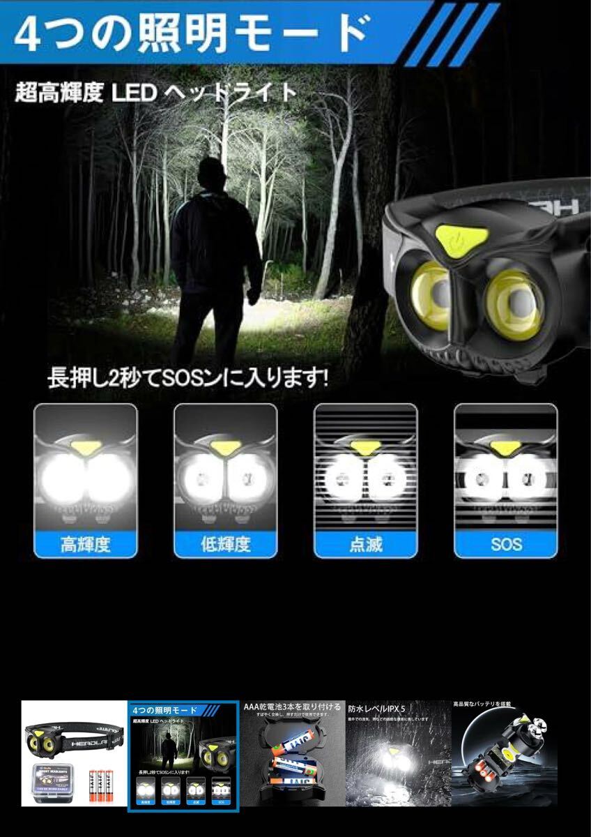 超高輝度LEDヘッドライト、4つの照明モード搭載、AAA乾電池3本使用。