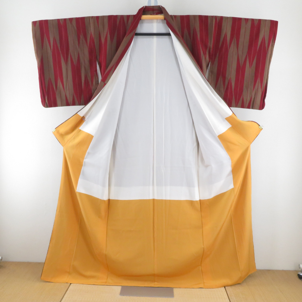 | 小紋 御召し 袷 矢羽根模様 エンジ色x茶色 広衿 正絹 カジュアル着物 身丈163cm |