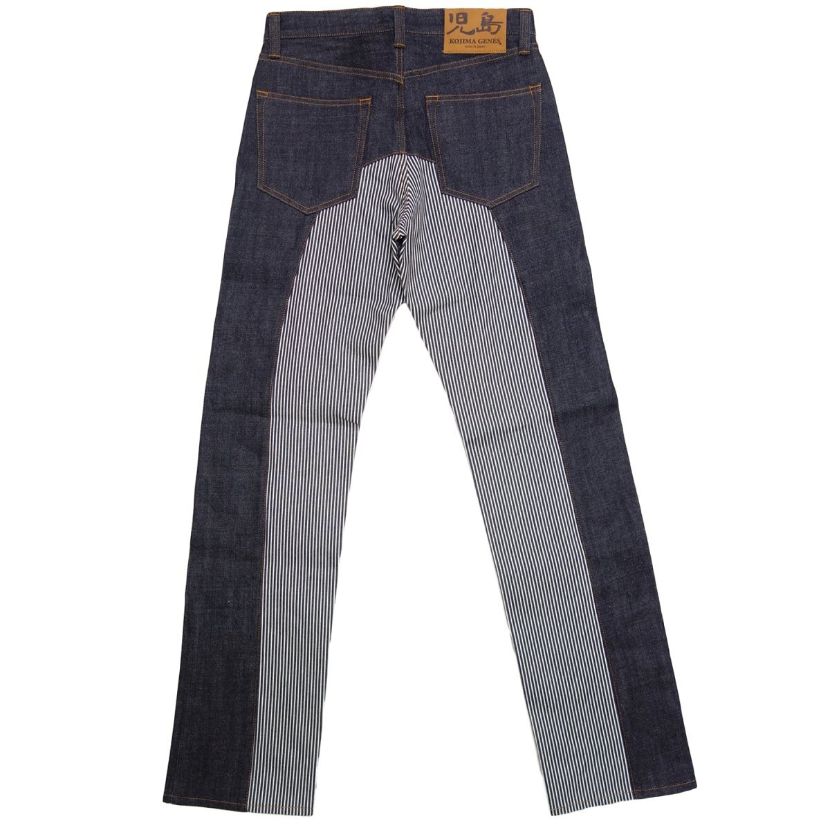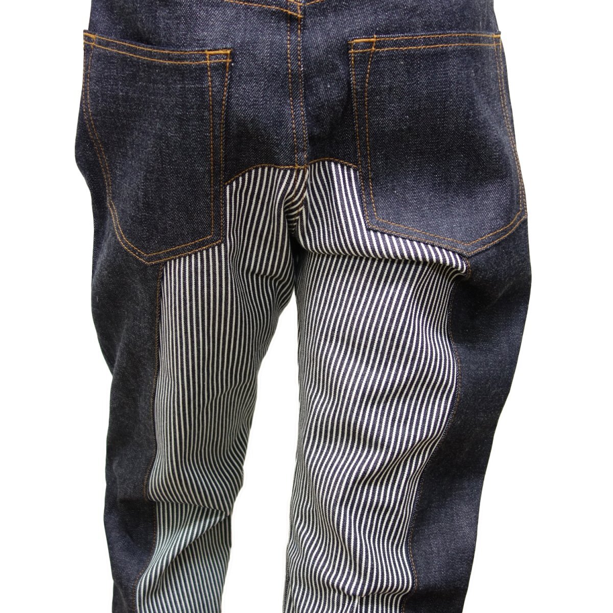 児島ジーンズのモンキーコンボパンツです。太すぎず細すぎないストレートタイプになります。Uの字型にストライプで切り替えられた斬新なワークパンツです。穿いたときに違和感がないように切替部分にはより繊細な技術が用いられています。メイドインジャパンの丁寧でしっかりとした仕上がりがセールスポイントのロングパンツです♪縦方向に切替が入っていることで生じる足長効果も嬉しいポイントです!穿いているだけで個性を主張できて、気分も上がるオススメのデニムパンツです♪