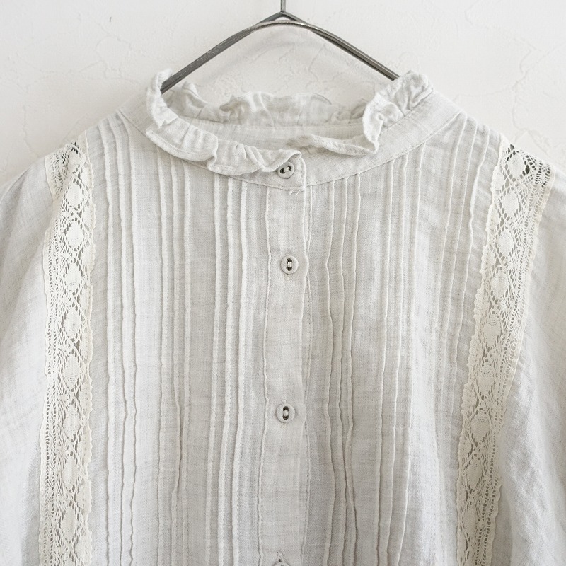 | Samansa Mos2 のヘリンボーン接結ガーゼレースブラウスです。カラーはライトグレージュ杢&オフホワイト(レース)です。薄く甘織りのヘリンボーン生地に、接結ガーゼを配したダブルクロス素材を使用。柔らかく、少し透け感がございます。スタンドフリルカラーに、ゆったりとした身幅、ボリュームのあるレースのフリルカフが施された袖があしらわれております。フロントと袖にピンタックとレースを配し、袖口はゴム入りです。ポケットはございません。 |