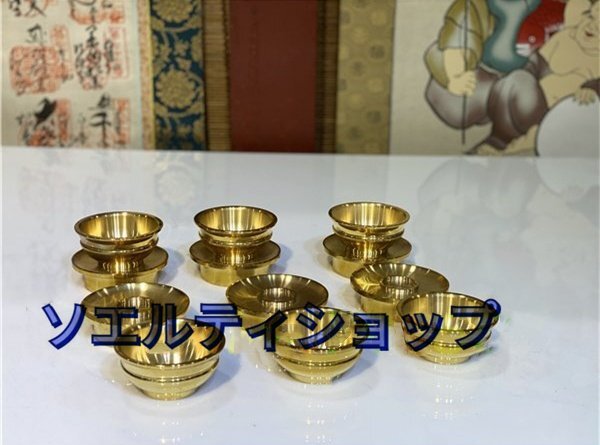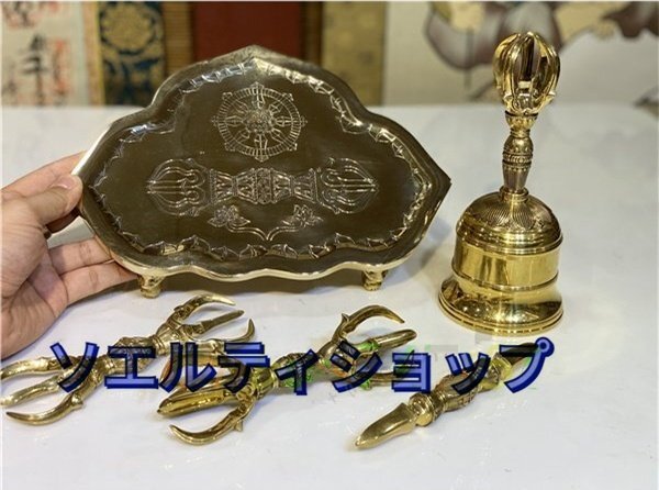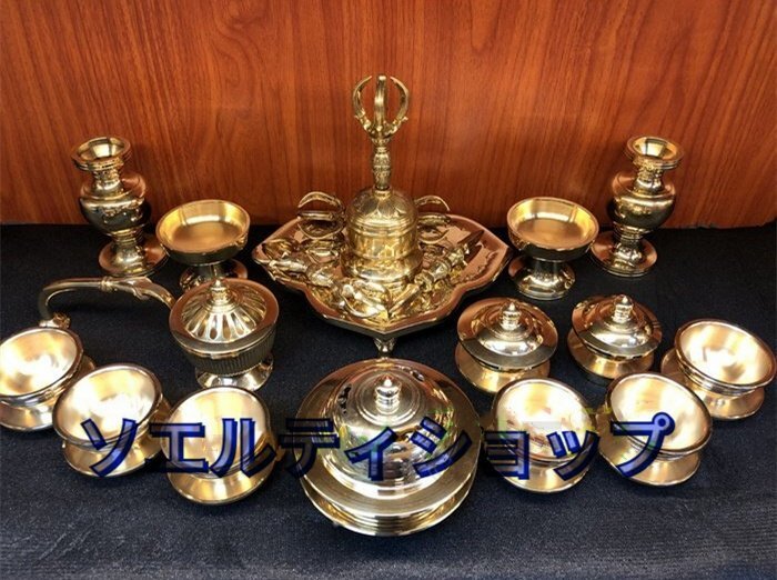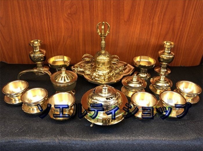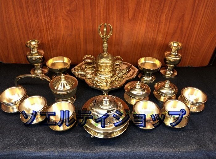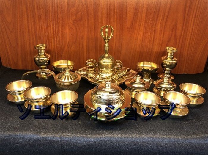 「密教法具 寺院仏具」真言宗 前具(一面器)大型 金剛杵/金剛鈴/金剛盤/六器/華瓶/火舎香炉/仏器 仏具 真鍮製 磨き仕上げ