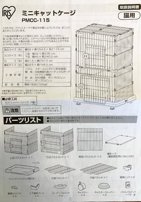アイリスオーヤマ キャットケージ PMCC-115です。商品の状態は主観ですが、1週間程で買い換えましたので、比較的きれいです。キャスターは取付済。キャスター台2個が欠品。おまけで水飲み器をおつけします。