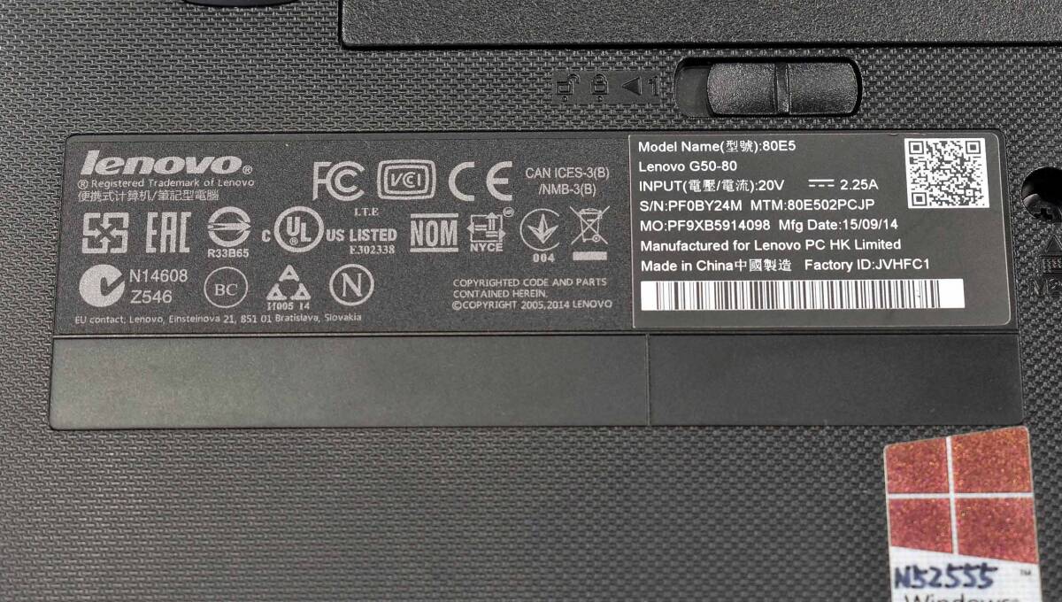 起動確認無し(ジャンク扱い) Lenovo G50 80E5 CPU:不明(起動無しの為) RAM:2G HDD:無し ※本体のみ (管:KP805