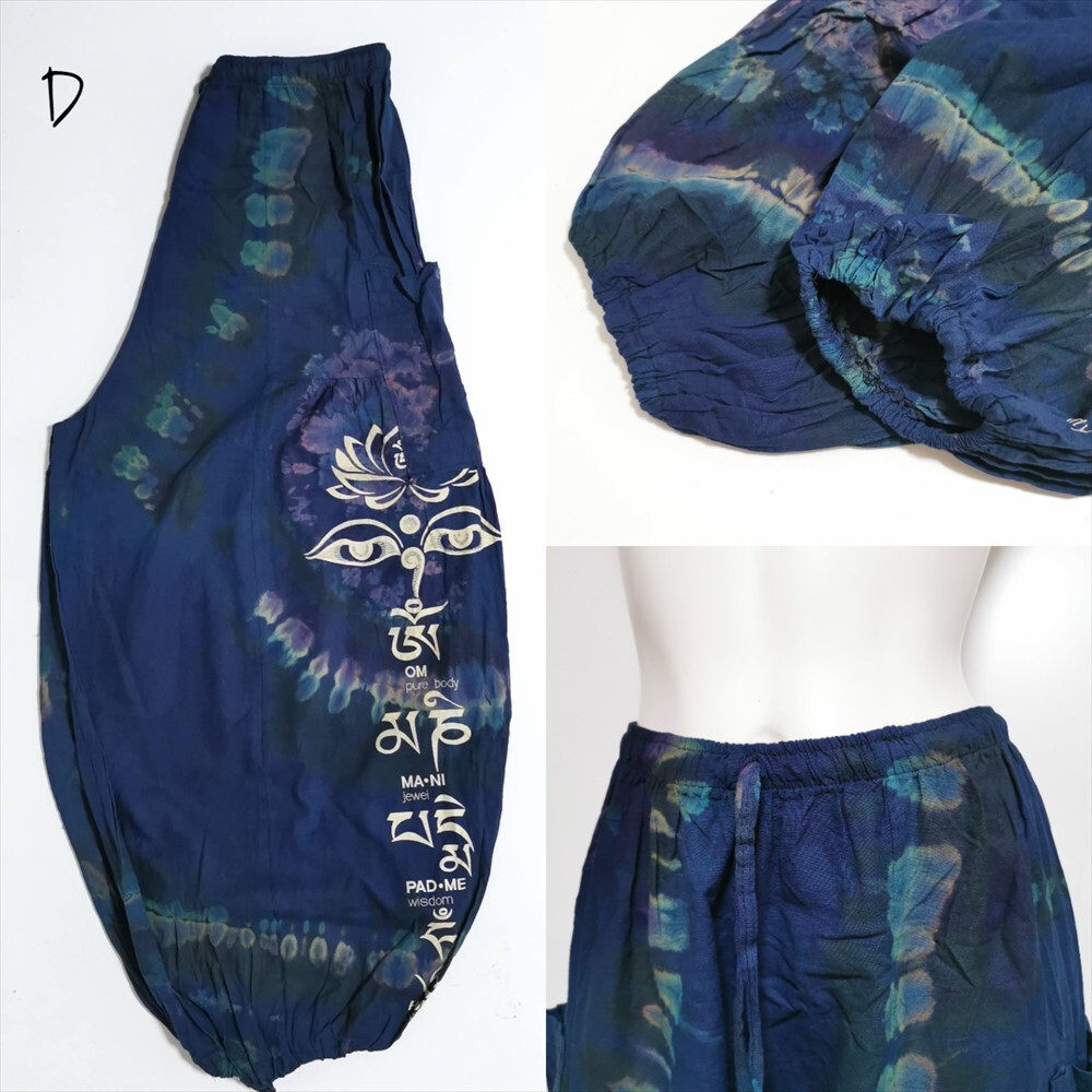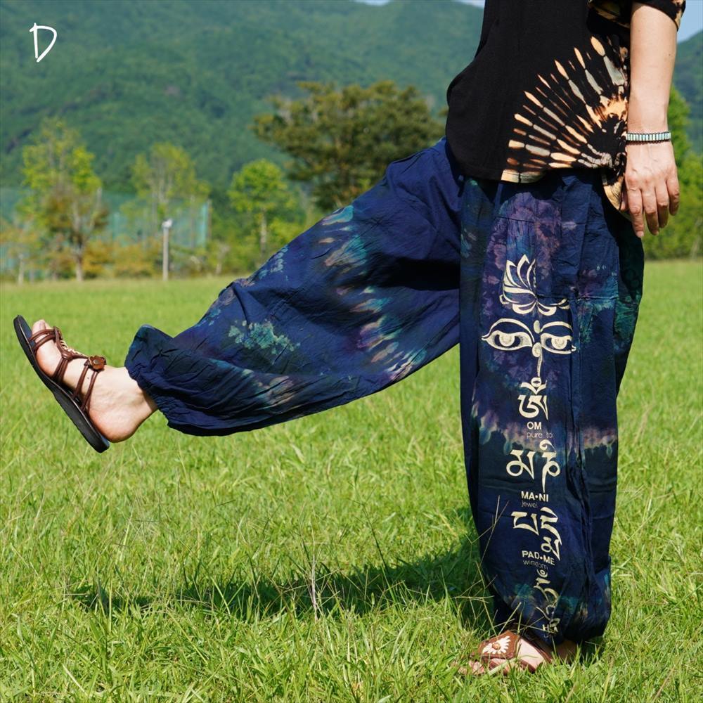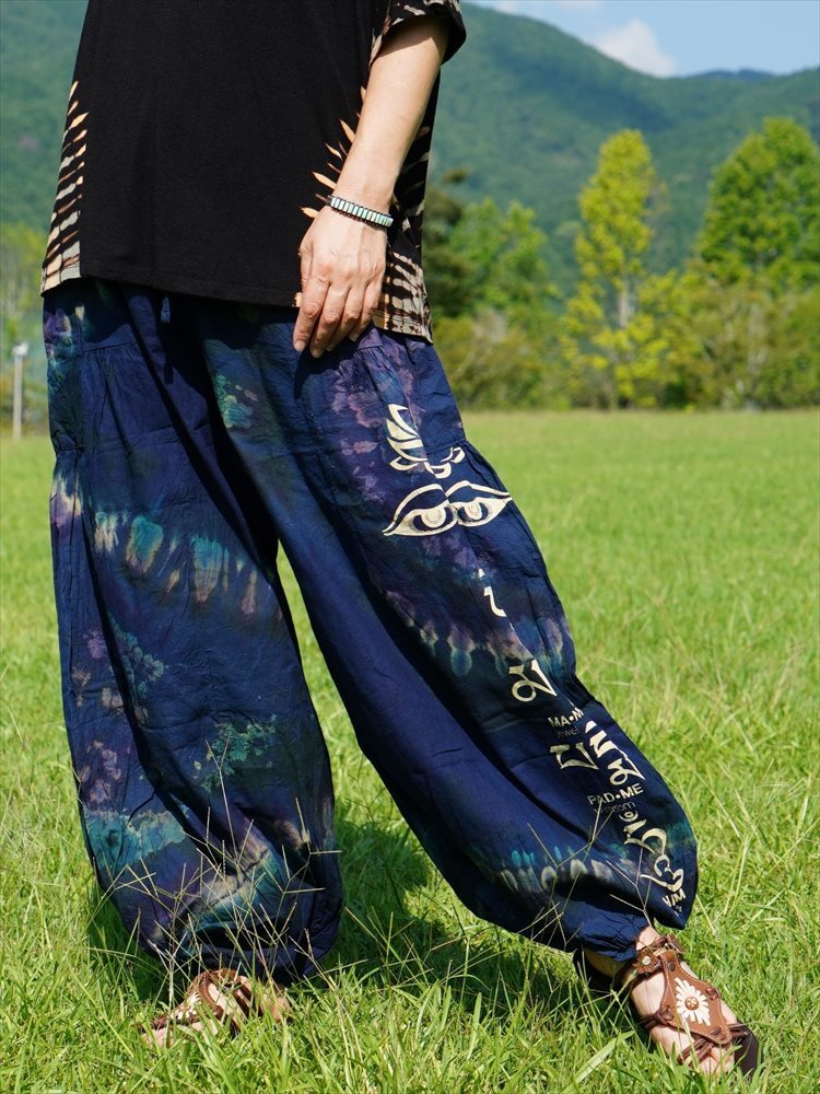 オンリーワンのおしゃれなタイダイに仏陀アイ(眼)と真言「オンマニぺメフム」がプリントされたアラジンパンツ♪大きめサイズの方や男性も楽しめる◎ボリューム感のあるゆったりシルエットです。ウエストはゴム&リボンのW仕立て、着ごこち楽々でサイズ調節も可能。肌ざわり柔らかなコットン素材でロングシーズンお楽しみ頂けます。冷える時期は暖かインナーなどを合わせてお楽しみ下さい。
