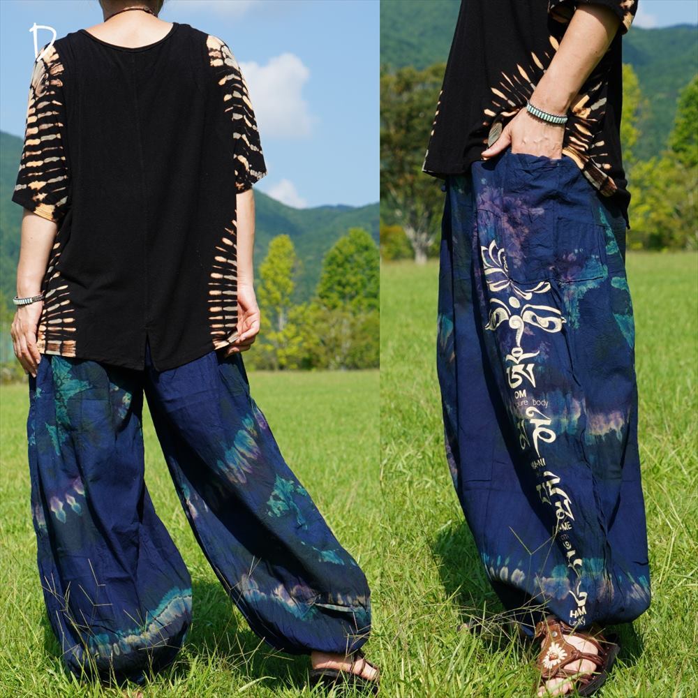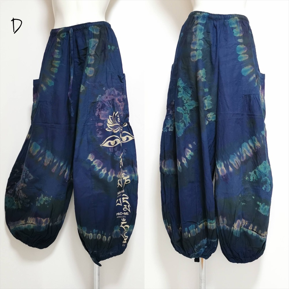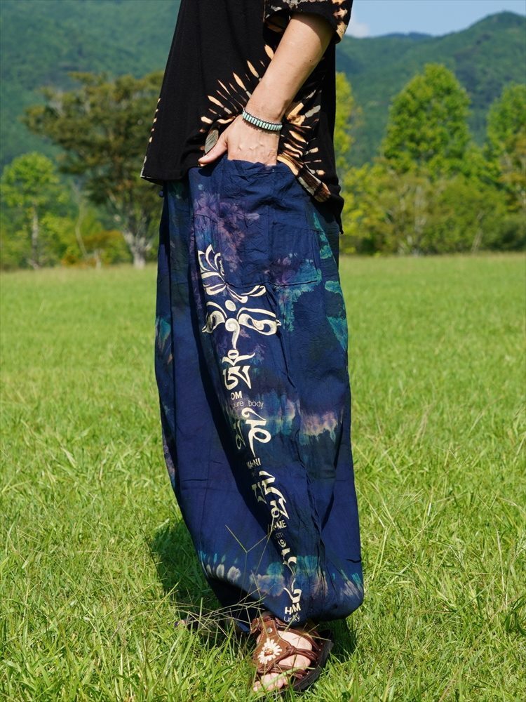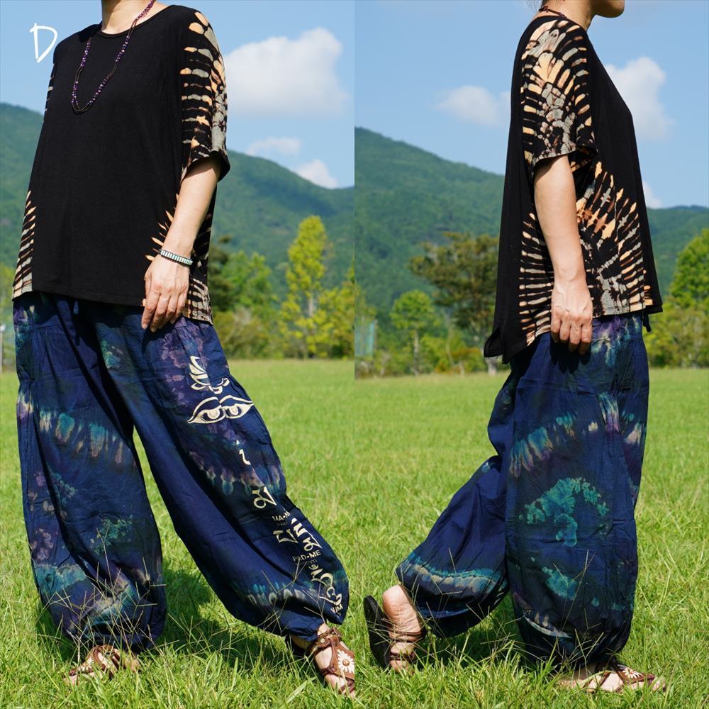 オンリーワンのおしゃれなタイダイに仏陀アイ(眼)と真言「オンマニぺメフム」がプリントされたアラジンパンツ♪大きめサイズの方や男性も楽しめる◎ボリューム感のあるゆったりシルエットです。ウエストはゴム&リボンのW仕立て、着ごこち楽々でサイズ調節も可能。肌ざわり柔らかなコットン素材でロングシーズンお楽しみ頂けます。冷える時期は暖かインナーなどを合わせてお楽しみ下さい。