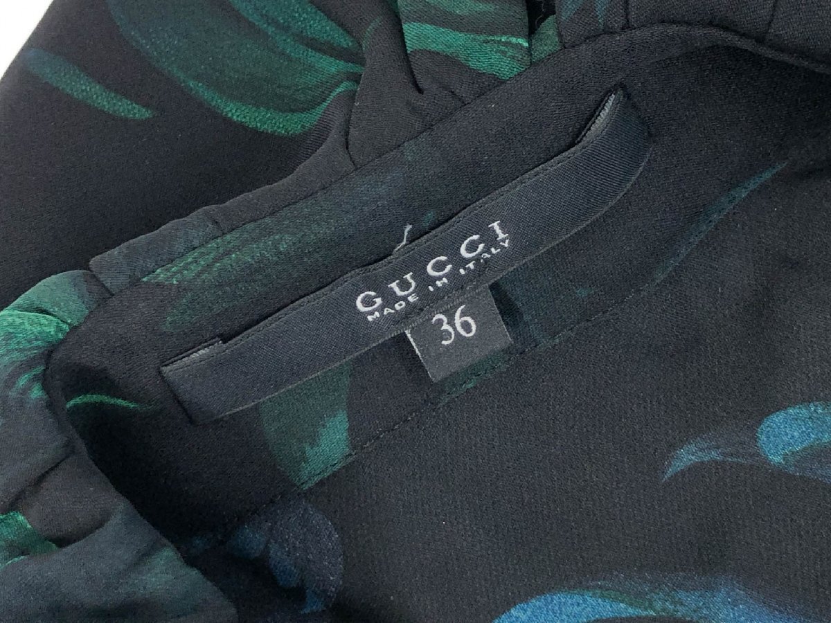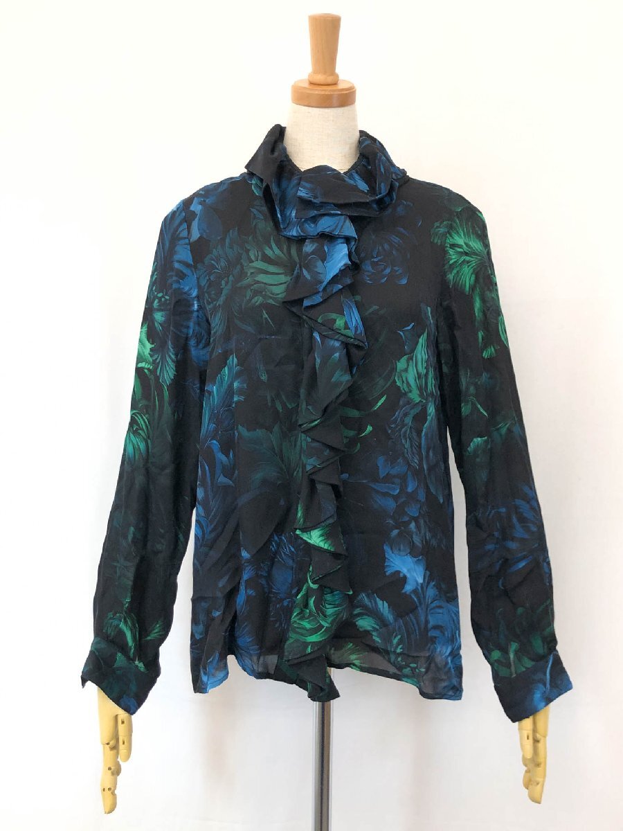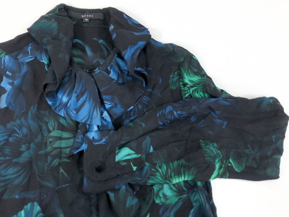 超美品【グッチ GUCCI】300585 ZX522 シルク100% フラワープリント 長袖 フリルブラウス シャツ (レディース) 36 黒系 伊製 ◇17LK2501◇