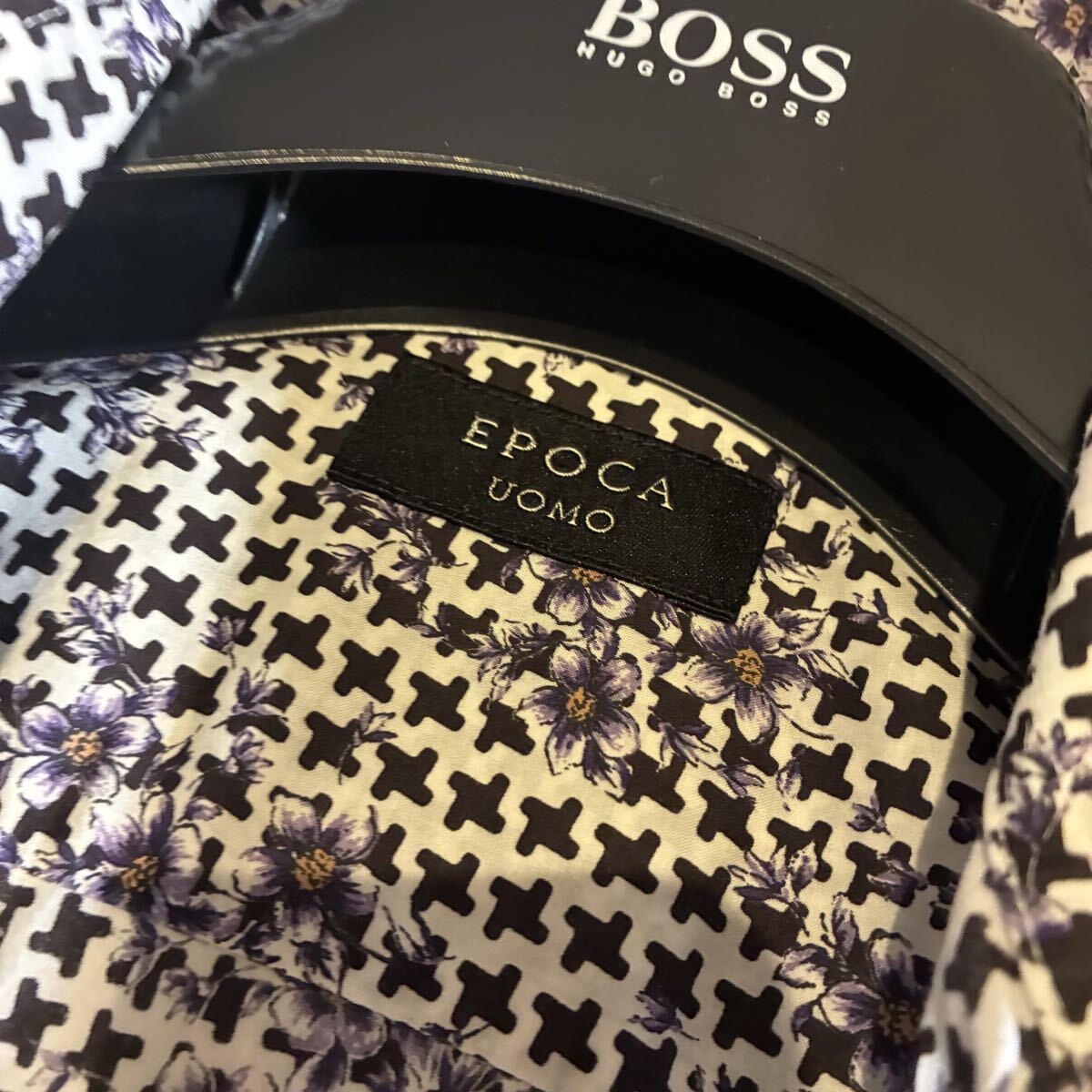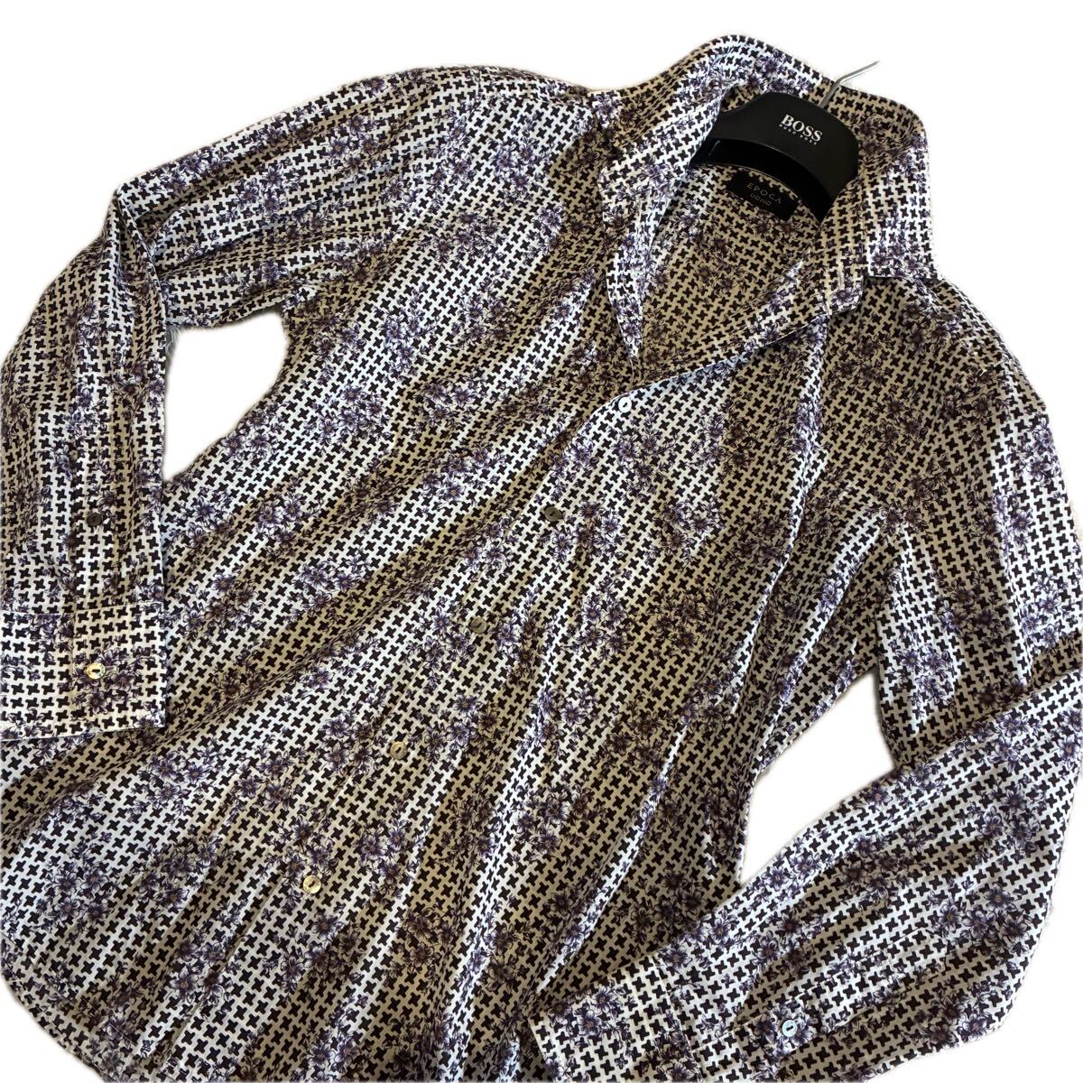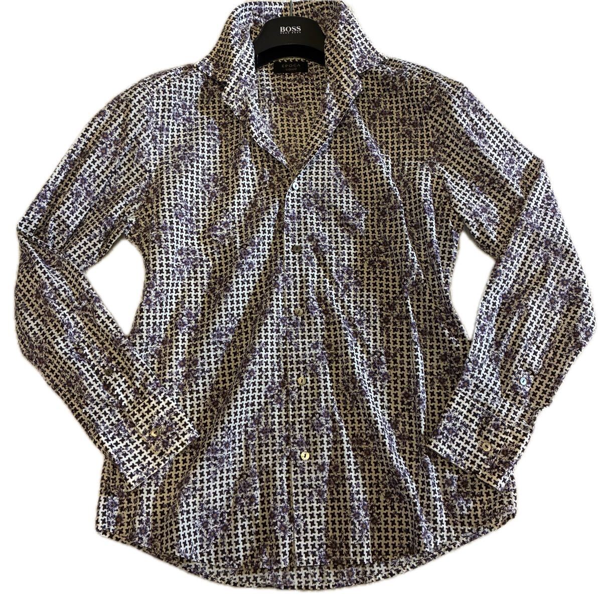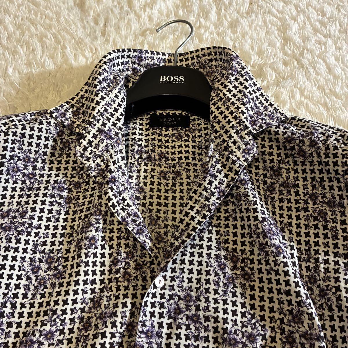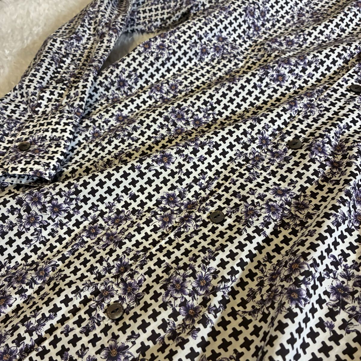 パープルの花柄が重ねられたエレガントなデザインで、上質なコットン素材を使用し、高級ブランドらしい洗練された仕上がりが特徴です。
