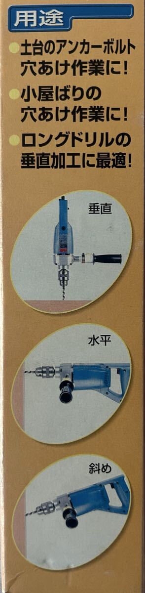 - 用途: 土台のアンカーボルト穴あけ作業、小屋の穴あけ作業、ロングドリルの垂直加工に最適
