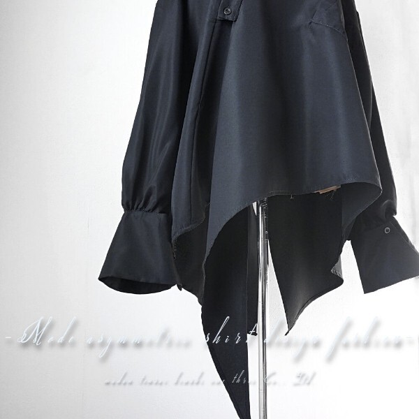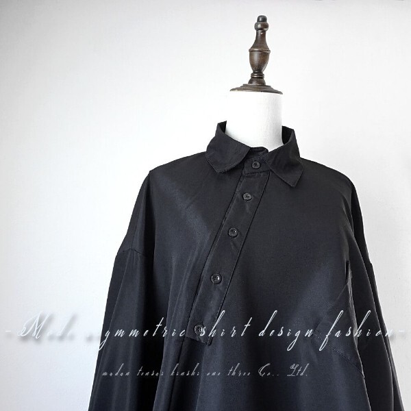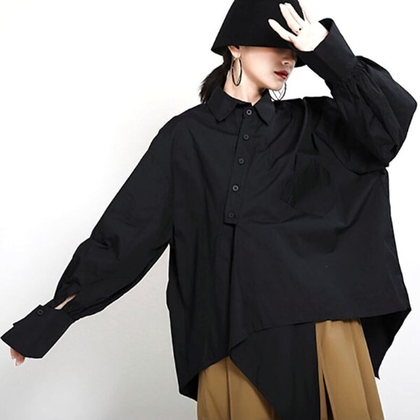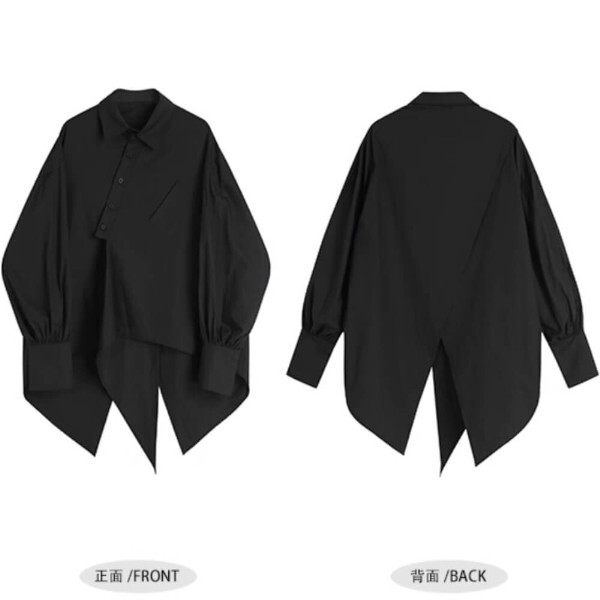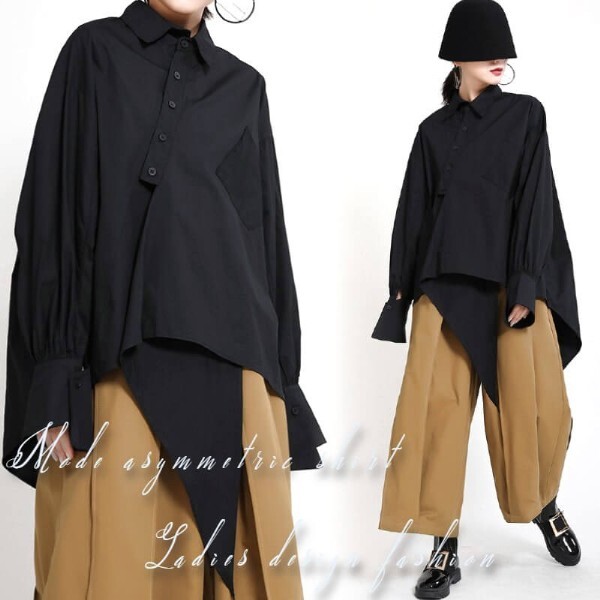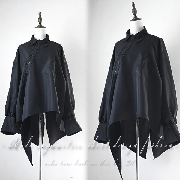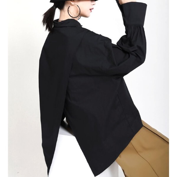【毎日当日発送】 ブラック 大きいサイズ モード系 アシンメトリーデザイン シャツ 長袖 トップス 黒 無地 個性的 オーバーサイズ 送料無料