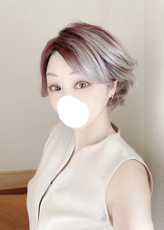 根元からグレー~ワイン~毛先グレージュと三層に変化する