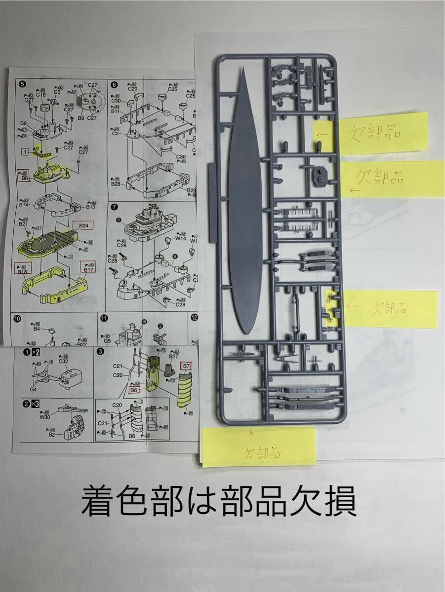 【リニューアル版】2016年頃発売のリニューアル品ですが、欠損部品のあるジャンク品です。確認した限り、透明窓枠部品を含む艦橋部品と煙突部品が欠損しています。(写真6枚目を御参照下さい)ウォーターライン共通パーツのWランナーも欠損しています。その他の部品については、確認した限り欠品はありませんが、見落としがあるかもしれませんので瑕疵に対する補償はできかねますのでご了承ください。箱はありません。内袋もありません。又デカールの類もありません。