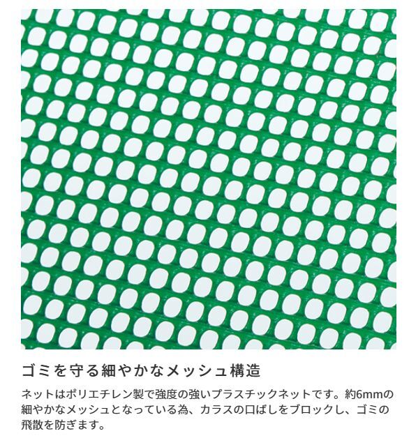 | ・ゴミを守る細やかなメッシュ構造 ネットはポリエチレン製で強度の強いトリカルネットです。 約6mmの細やかなメッシュとなっている為、カラスの口ばしをブロック し、ゴミの飛散を防ぎます。 | ||||||||||||||