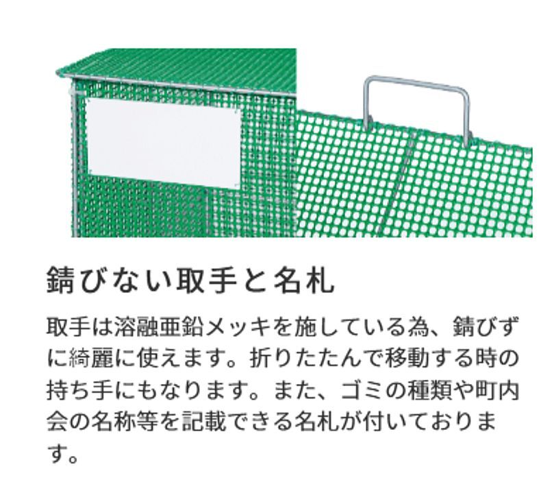 | ・持ち手と名札 折りたたんで移動する時の持ち手と、ゴミの種類や町内会の名称等を記載 する事が出来る名札が付いております。 | ||||||||||||||