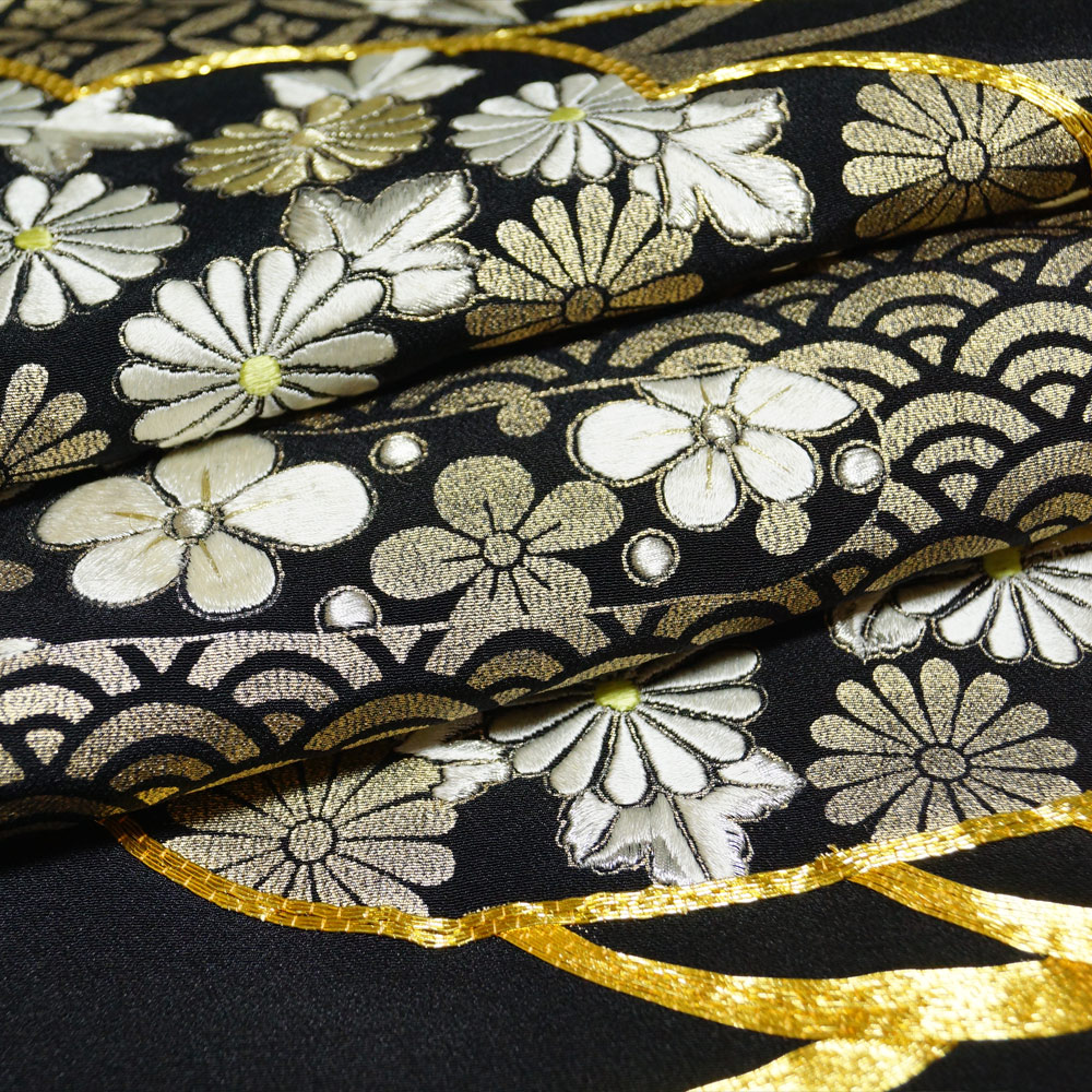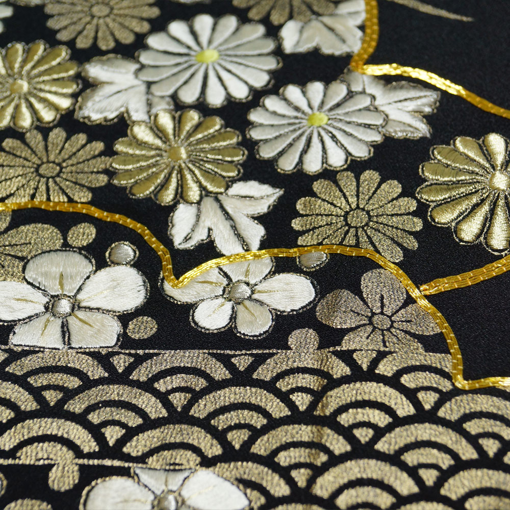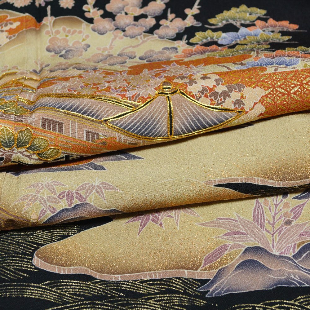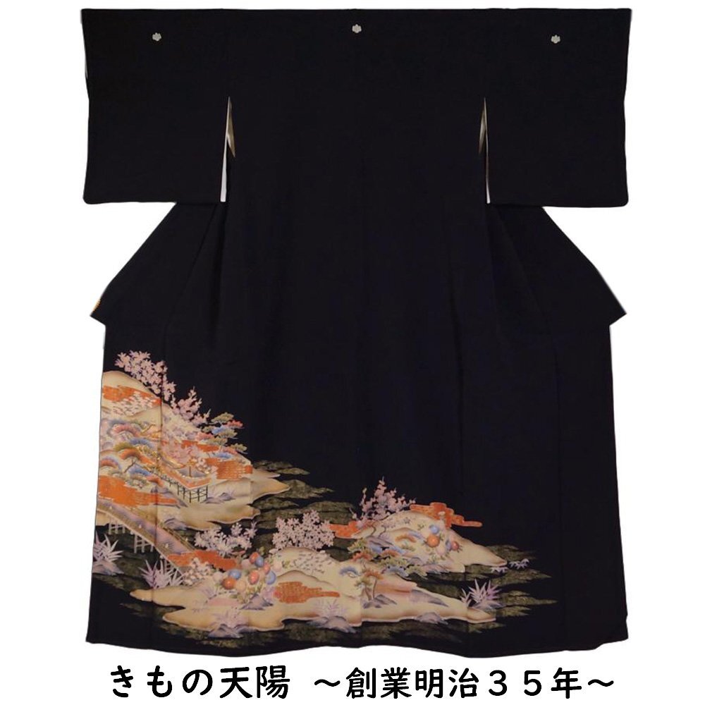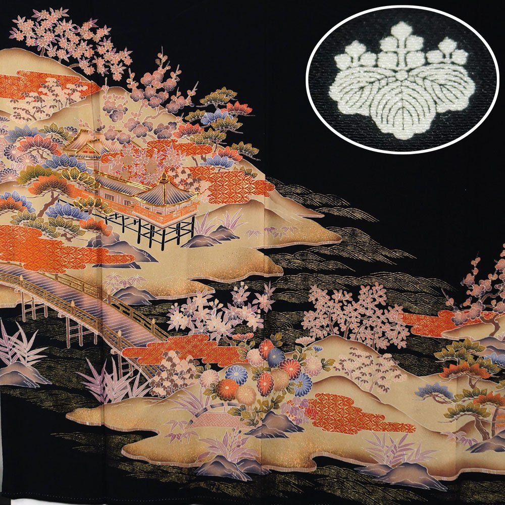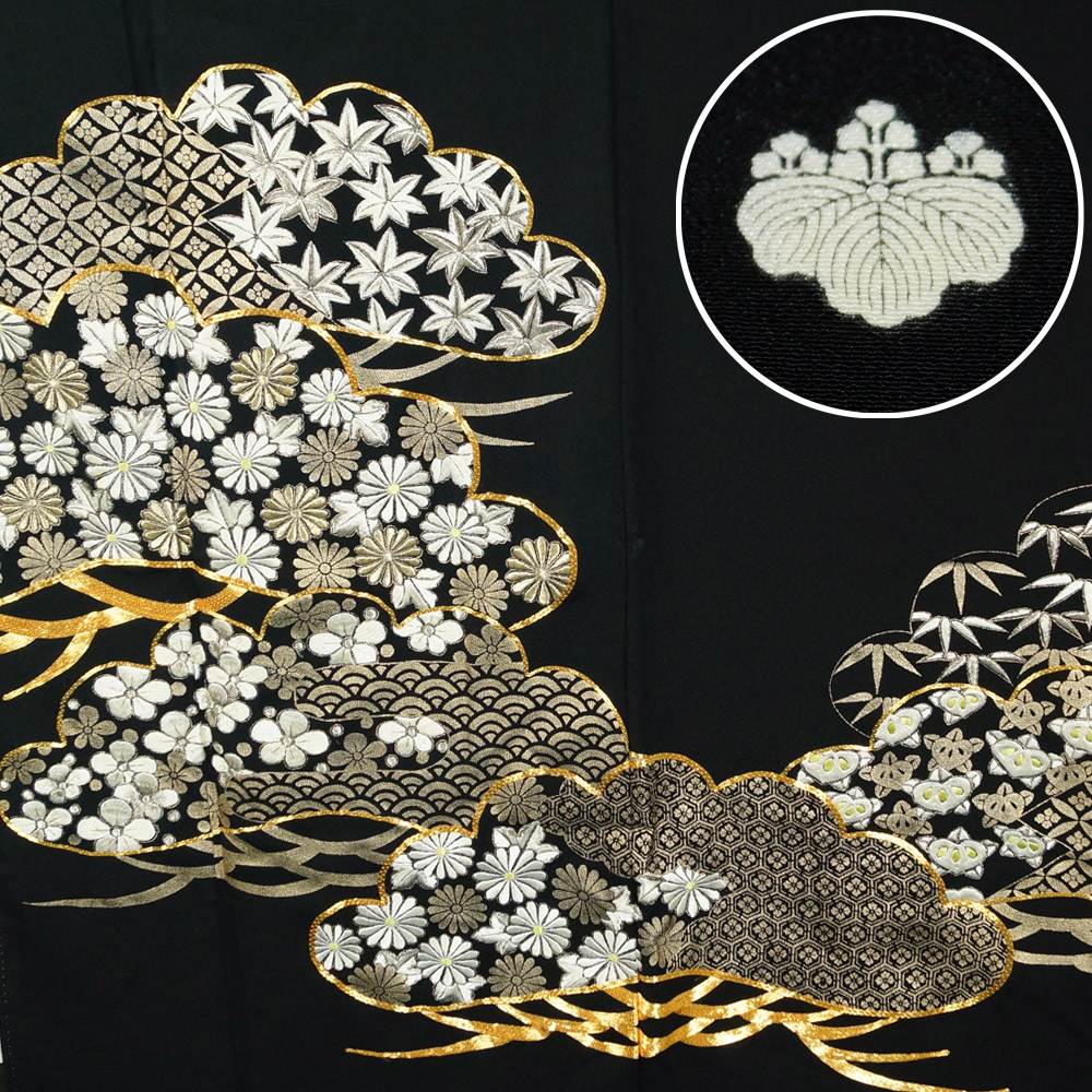 | 品 名 | 黒留袖 春秋庭園模様 刺繍 金駒刺繍 五三の桐紋 五つ紋入り 【中古 リサイクル着物 留袖 五つ紋 縮緬 正絹 リサイクル着物 黒留め袖 結婚式 着物ドレス 黒留 アンティーク着物 留袖 つるし雛】 | ||