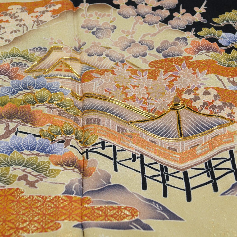 | 商品 説明 | 黒色の正絹地にお屋敷に春秋の草花、庭園などの模様が施された黒留袖です。五三の桐紋 五つ紋入りです。 |