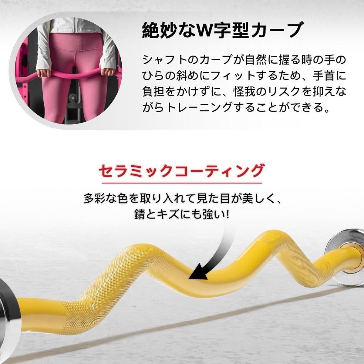 「絶妙なW字型カープ」シャフトのカープが自然に握る時の手のひらの斜めにフィットするため、手首に負担をかけずに、ケガのリスクを抑えながらトレーニングすることができる。