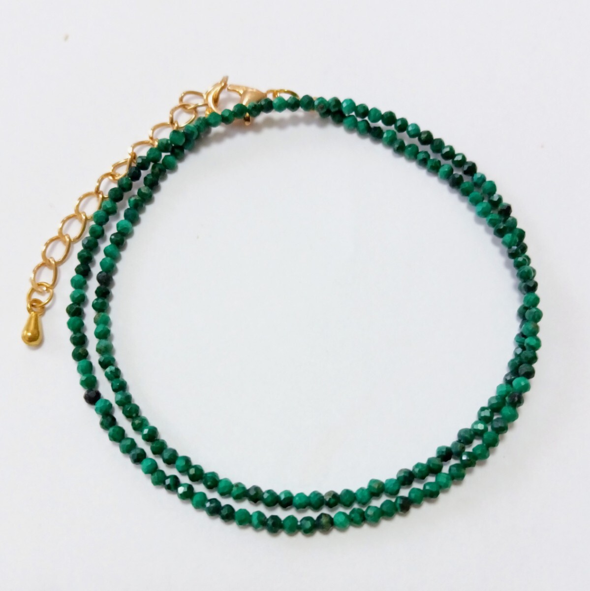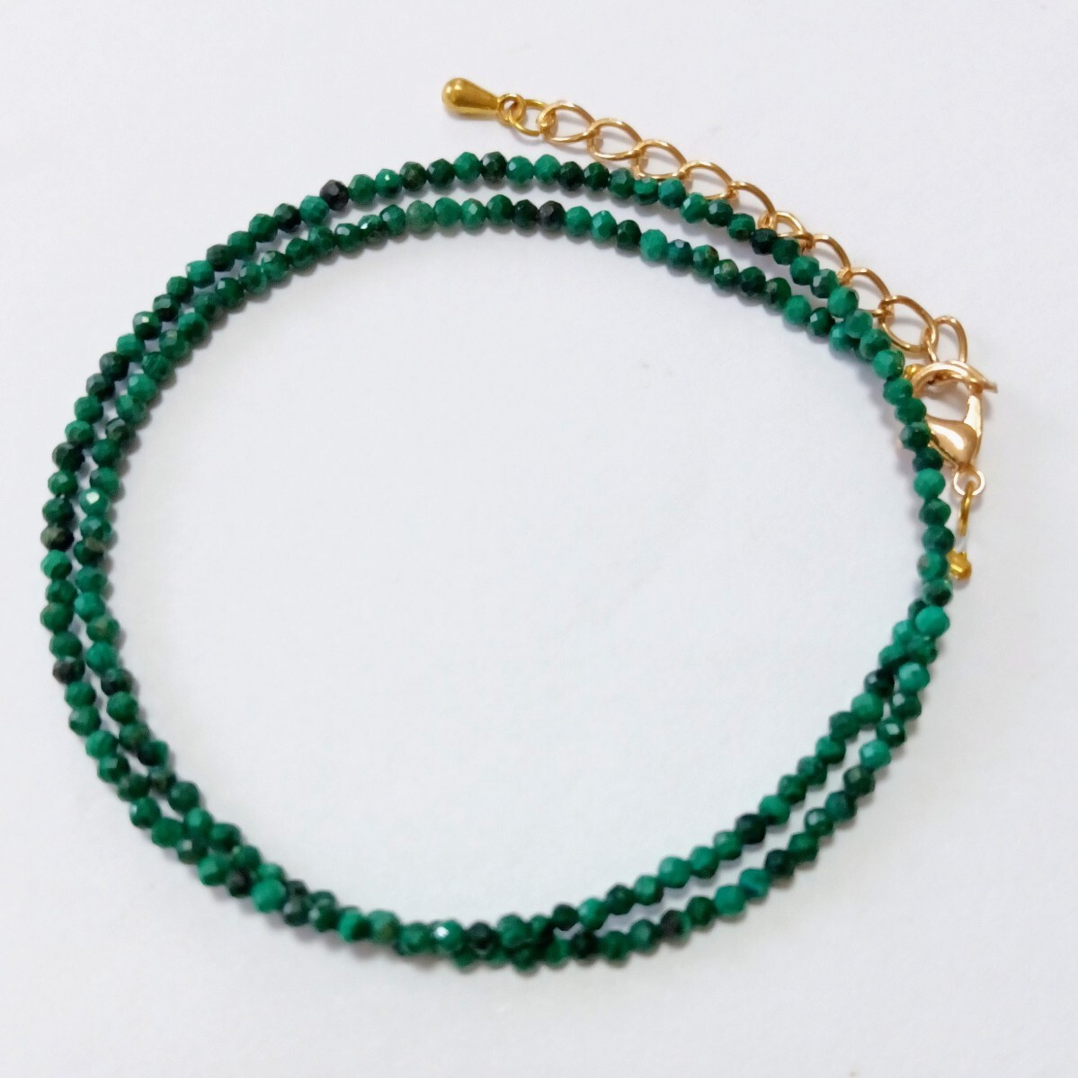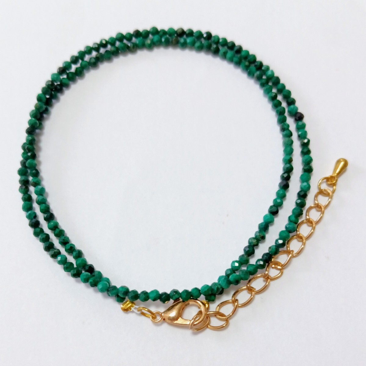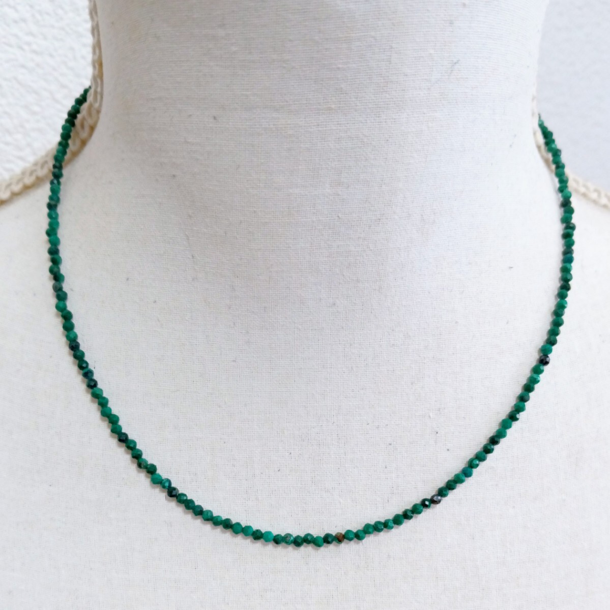濃い緑色のラウンドカット、天然マラカイト(クジャク石)のネックレスです。特有の斑模様があります。